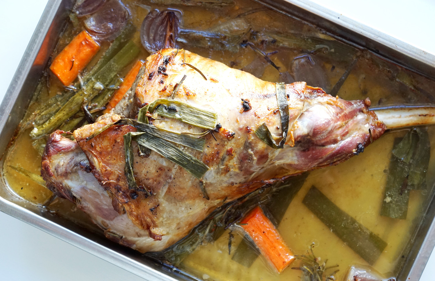 3. Kom lammekøllen i et ovnfast fad (ca. størrelse af ½ bradepande) og hæld vandet ved. Skræl gulerødderne, fjern skallen fra rødløget og skær det skyl forårsløgene og skær enderne fra dem. Kom grøntsagerne og de sidste kviste rosmarin i vandet ved lammet.