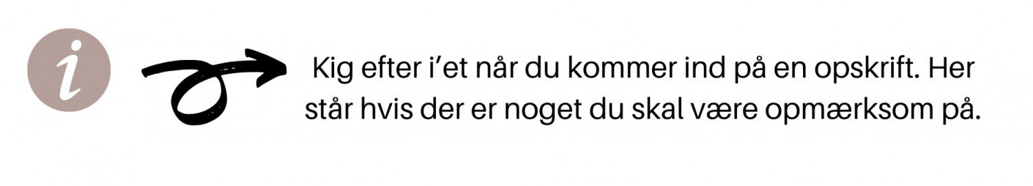 Retterne tager ca. 30 minutter at lave, men enkle dage vil der dog ind i mellem være simreretter, som skal stå på komfuret i 1 times tid. Kig efter i’et når du danner dig overblik over kommende uges madplan. Her vil det tydeligt stå hvis der er noget du skal planlægge efter – f.eks. hvis noget har lidt længere tilberedningstid. Du behøver ikke læse opskrifterne igennem før du skal lave maden. Men kig om der er et “i” med info i starten af opskriften.