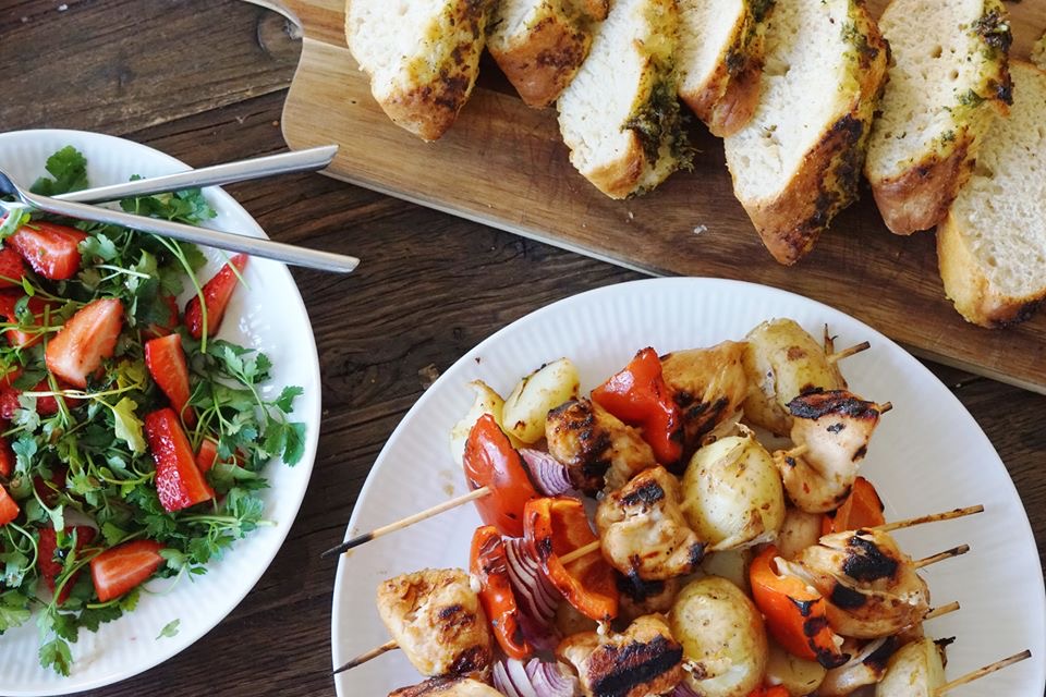 Fordel kartofler, tomater, rødløg, kylling og peberfrugt på dine grillspyd.