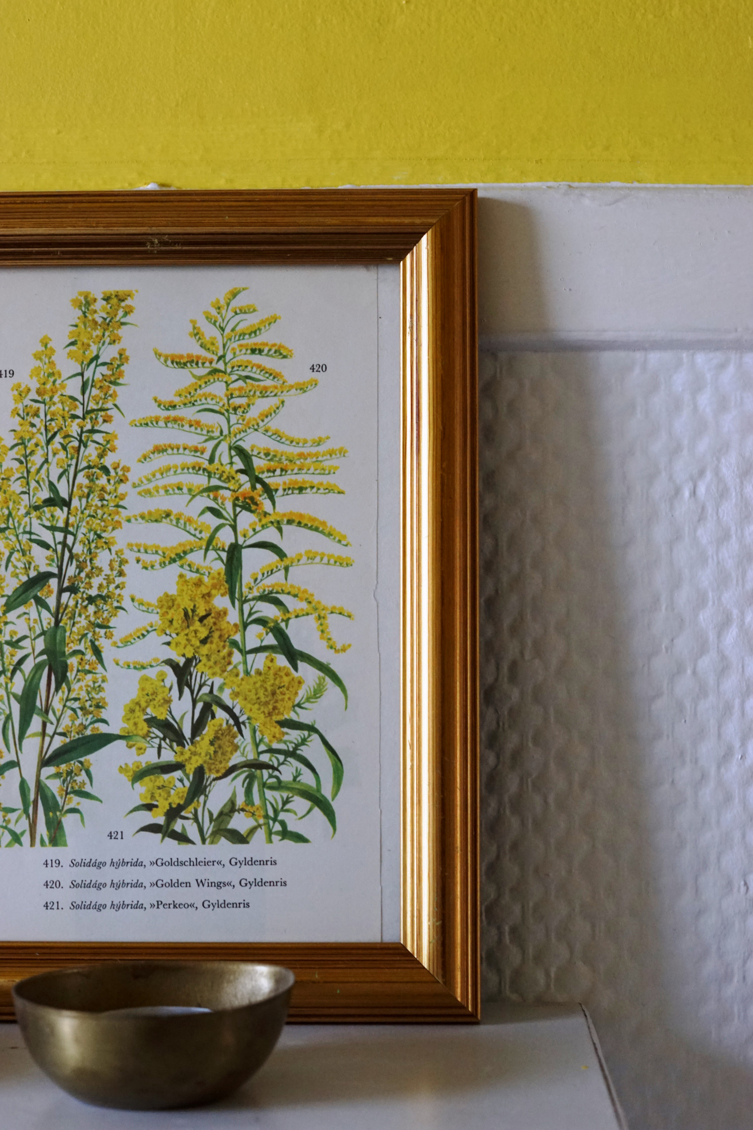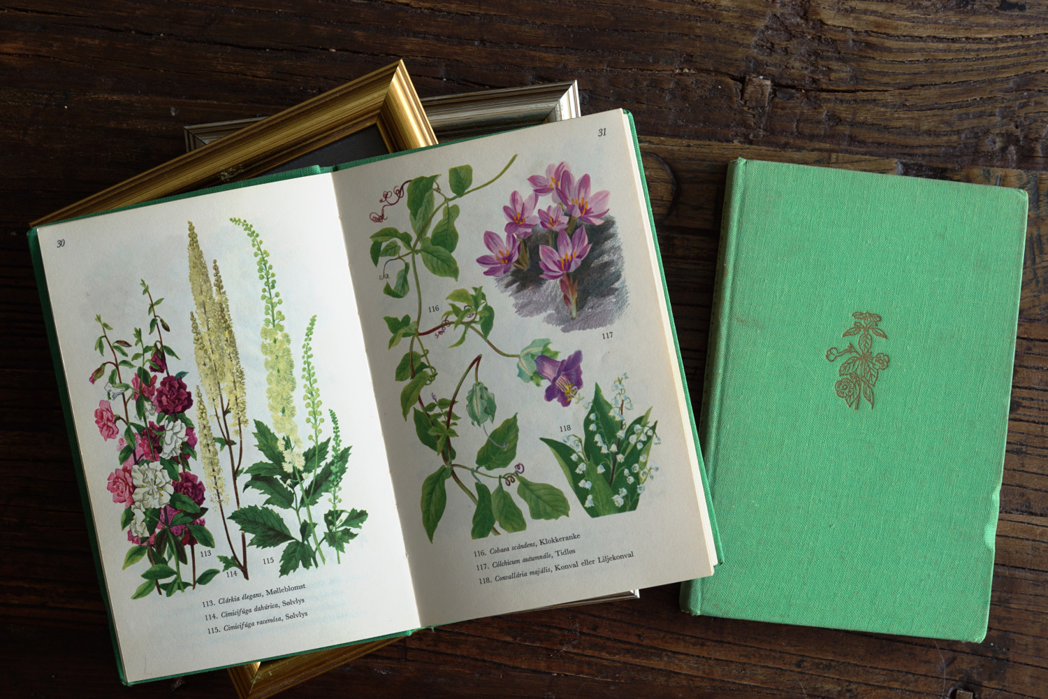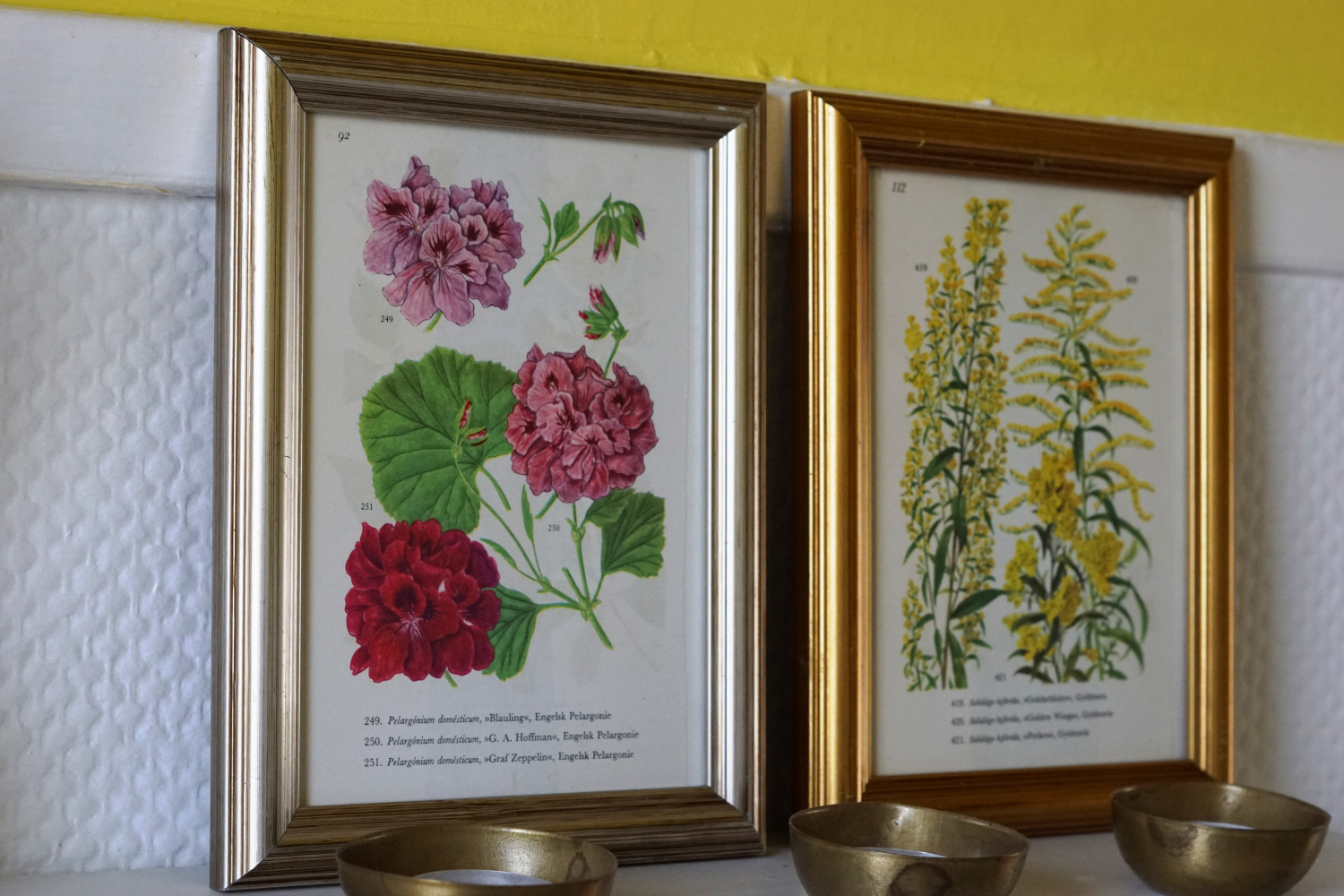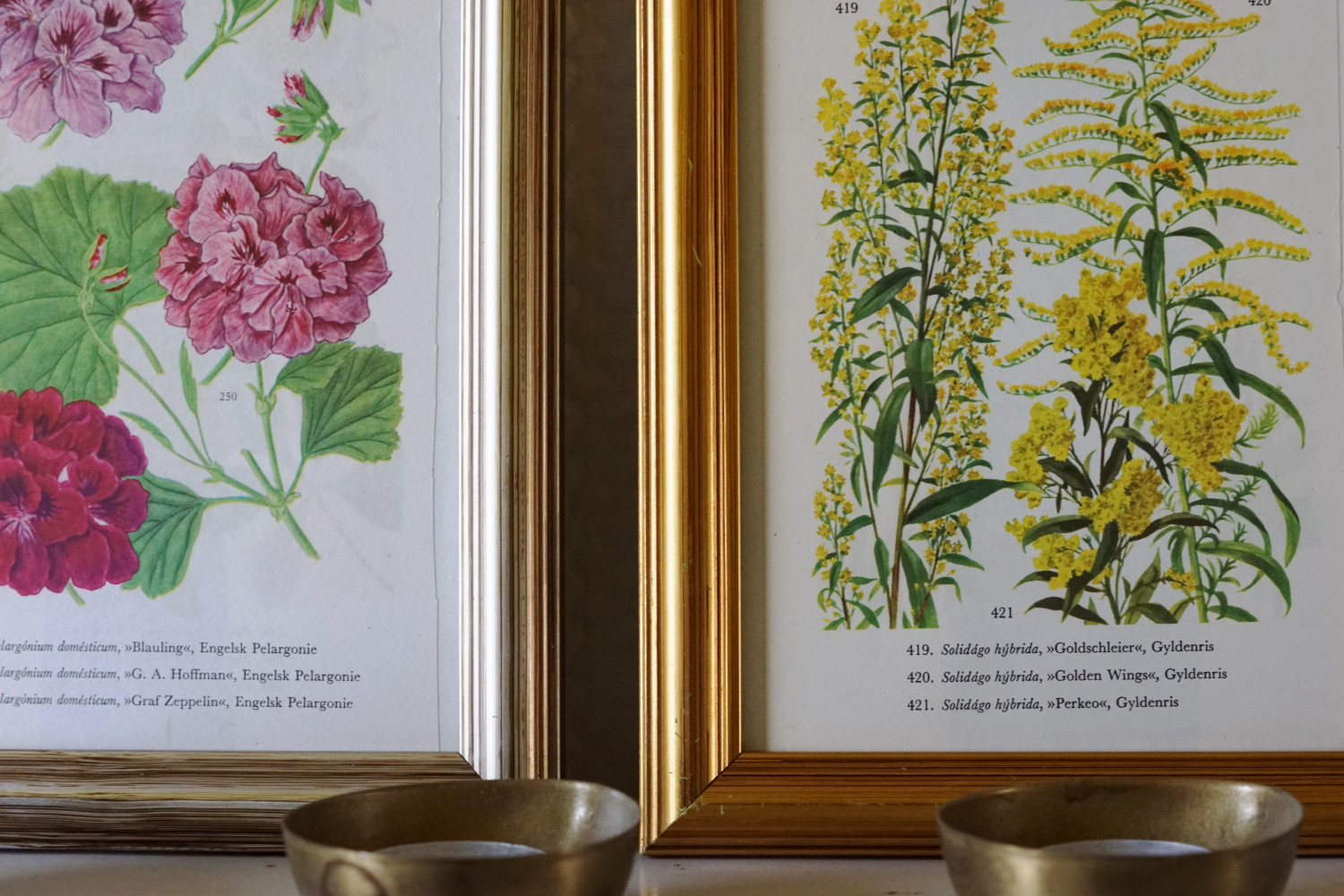 Det eneste du skal bruge er et par rammer og en gammel blomsterbog fra tiden før man googlede sig frem til navnene på forskellige blomster og planter. Genbrugsbutikkerne bugner med disse gamle billede-opslagsbøger, hvor der er tegninger af blomster og deres danske og latinske navn. De er fine og flotte og det er lidt en skam at de oftest bare kasseres.