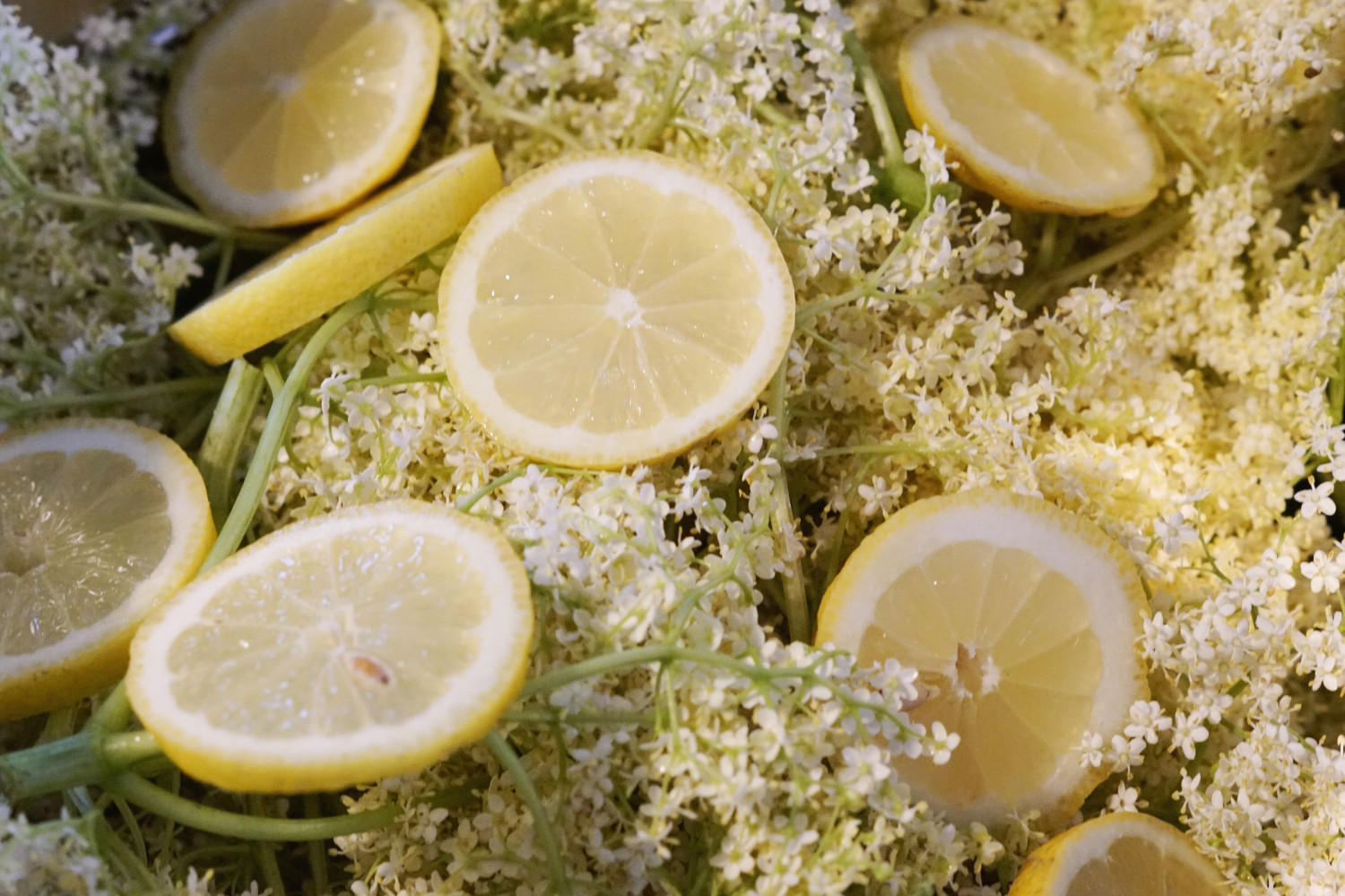 Skær to af citronerne i skiver og læg dem ovenpå hyldeblomsten. Pres herefter saften af de tre sidste citroner og hæld saften over. Læg gerne skallerne fra de tre pressede citroner ned i gryden også.