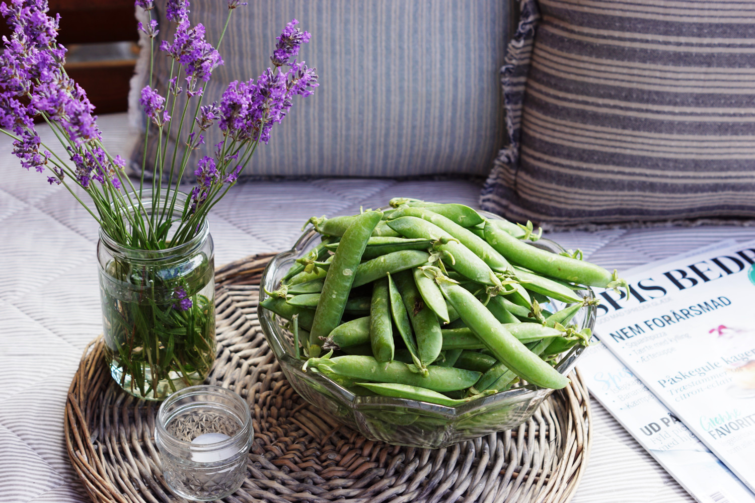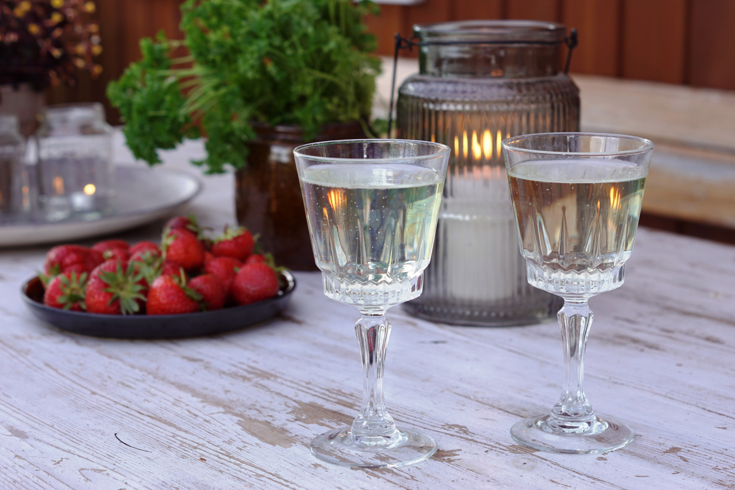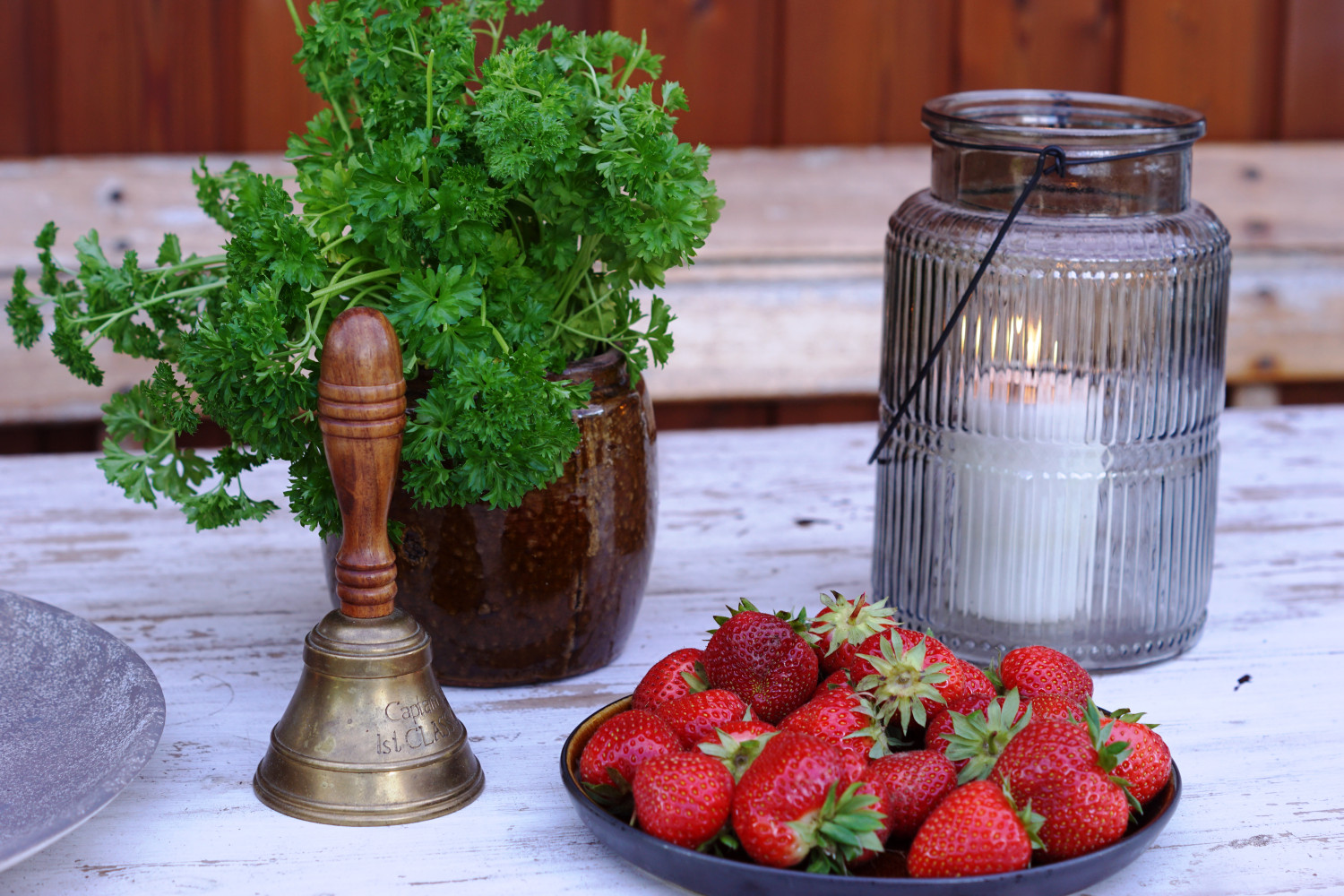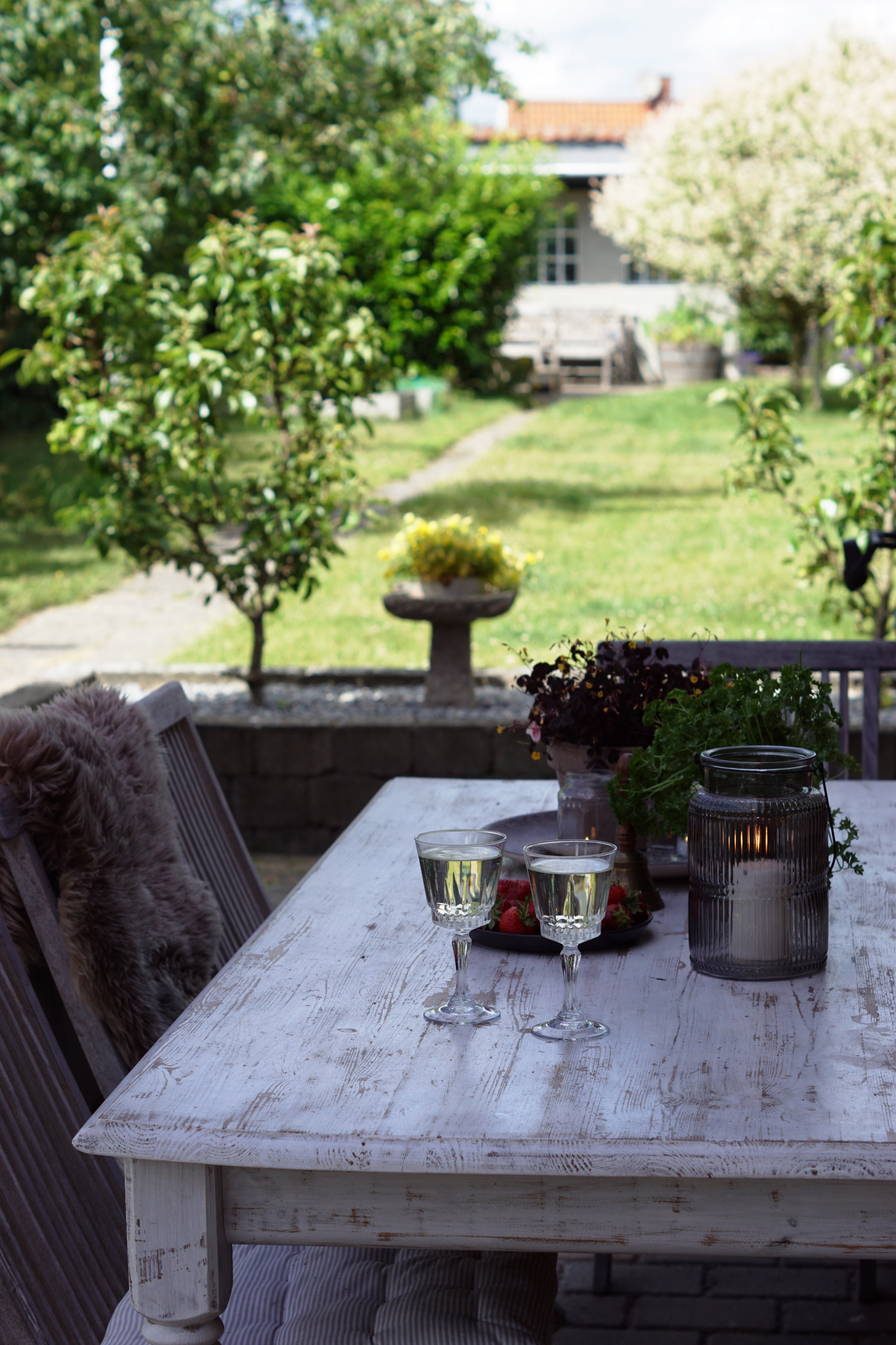 Man behøver ikke spendere mange penge på nipsting til terassen – her er det syltetøjsglas som vase og fyrfadsstage og en antik skål, som genbrugsbutikkerne bugner med.