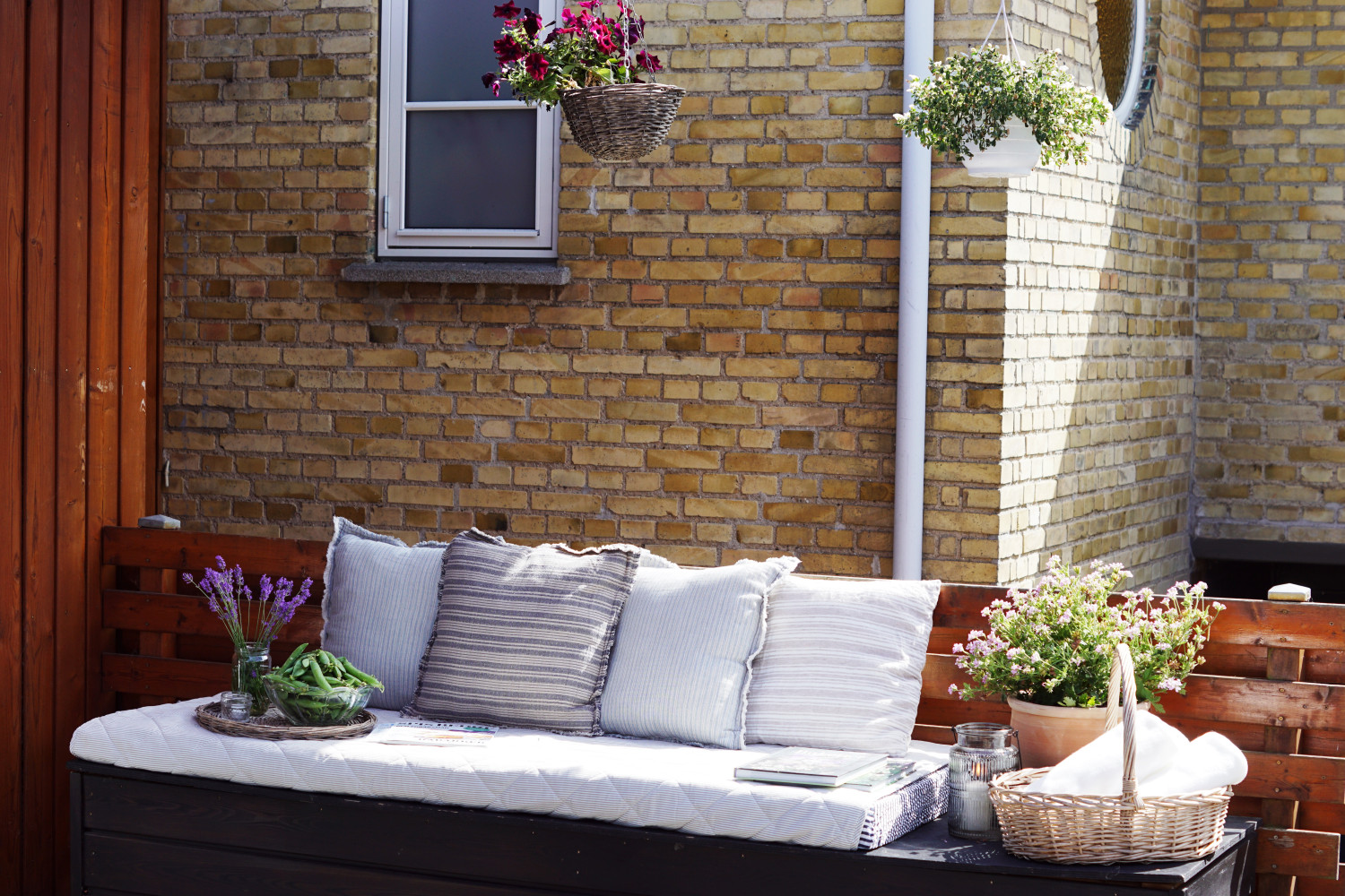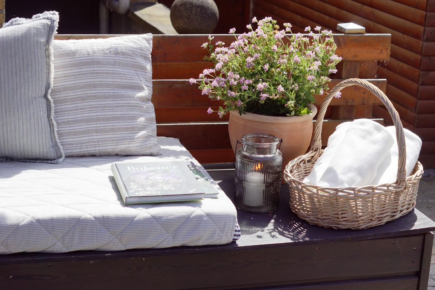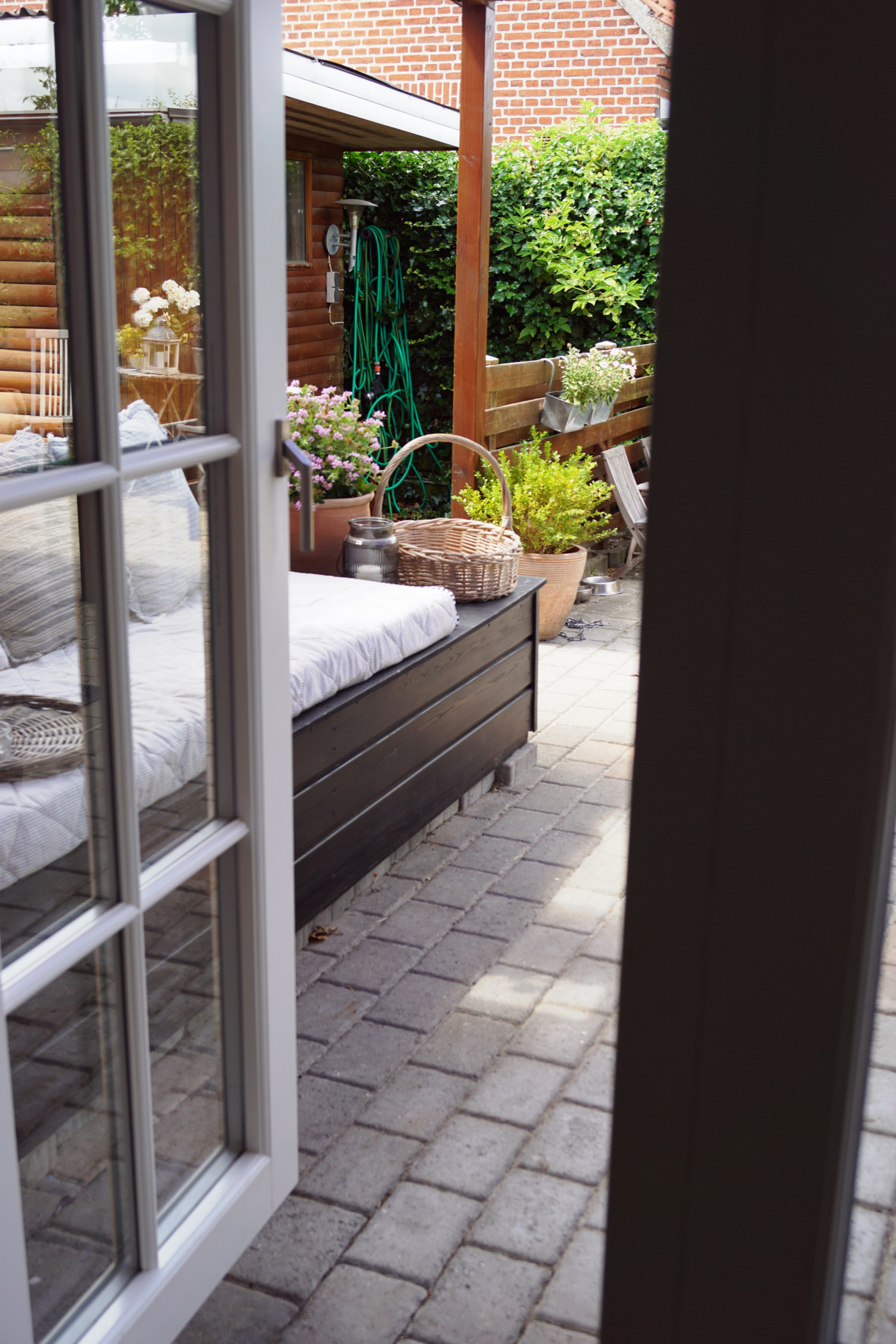 På den hjemmebyggede hyndebænk (den sorte trækasse) har jeg indrettet en lille “hygge og slap af krog” med en madras man kan ligge i skyggen og få en lur på en varm sommerdag eller sidde og få en drink og lidt snacks, hvis vi f.eks. har gæster til grillmad. Og så er der i kurven fleecetæpper man kan forsyne sig med på lidt køligere aftener.