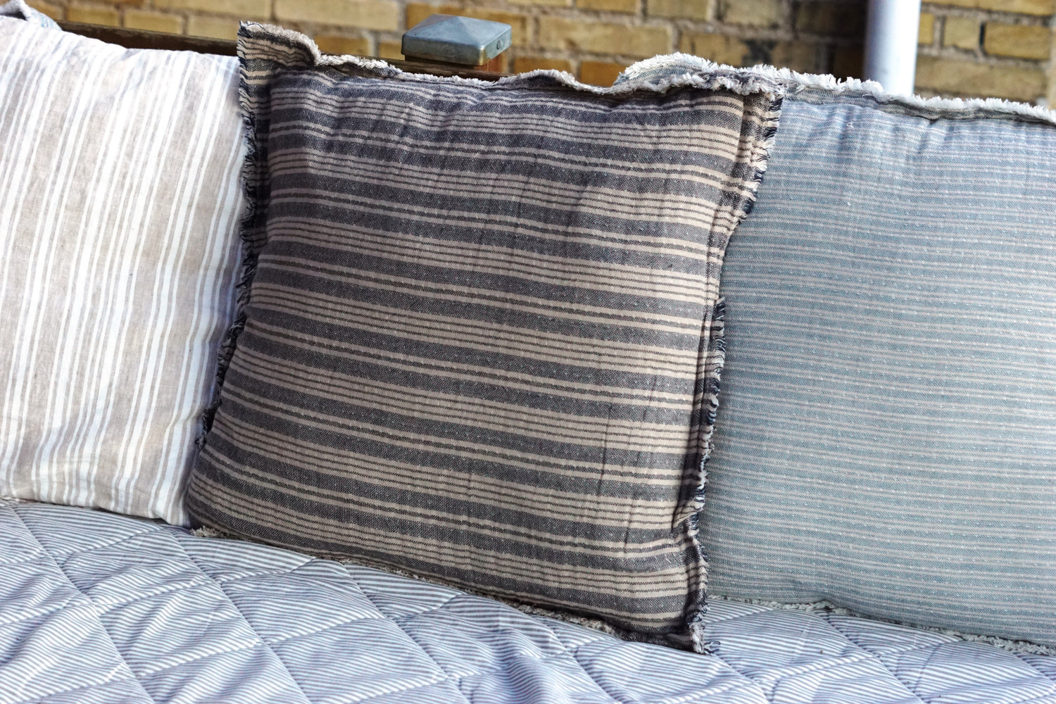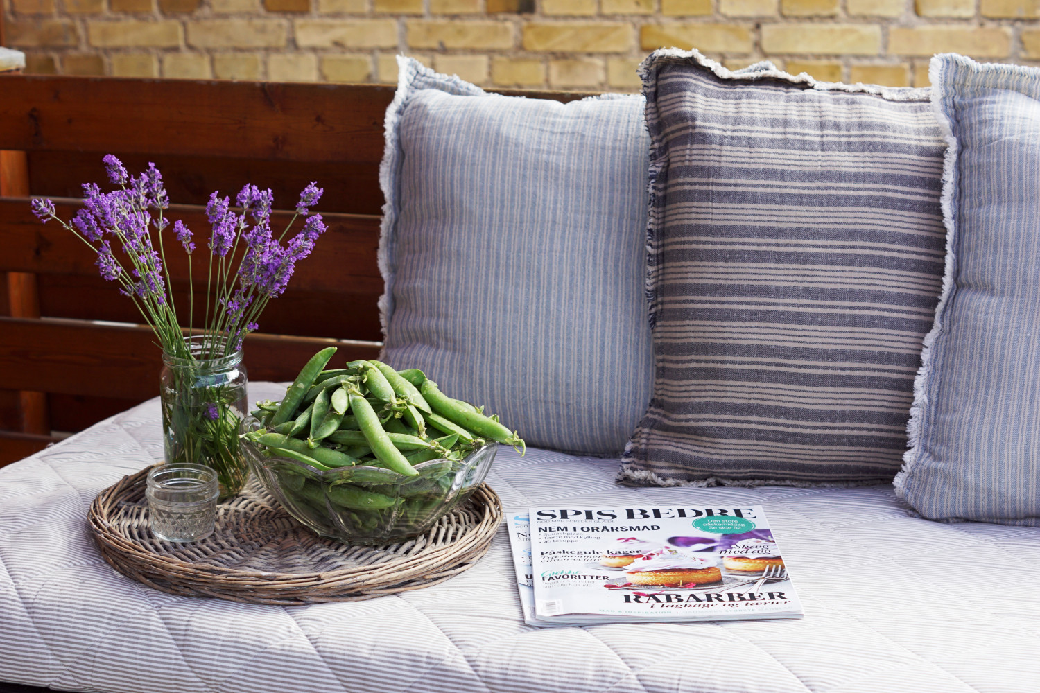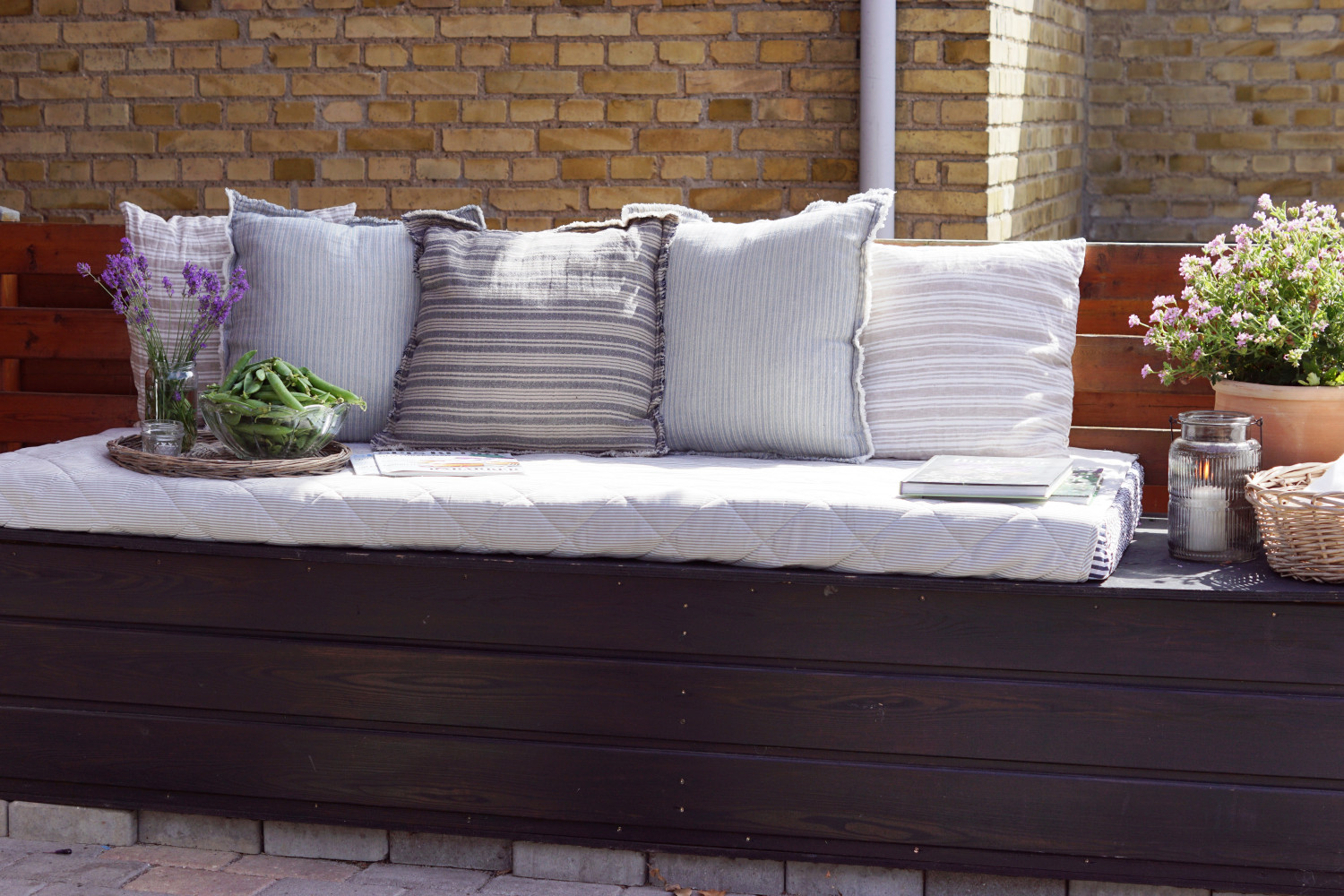 Forskellige bløde puder i ikke alt for sarte farver er praktiske på terrassen. Disse er fra Søstrene Grenes nuværende sommerkollektion.