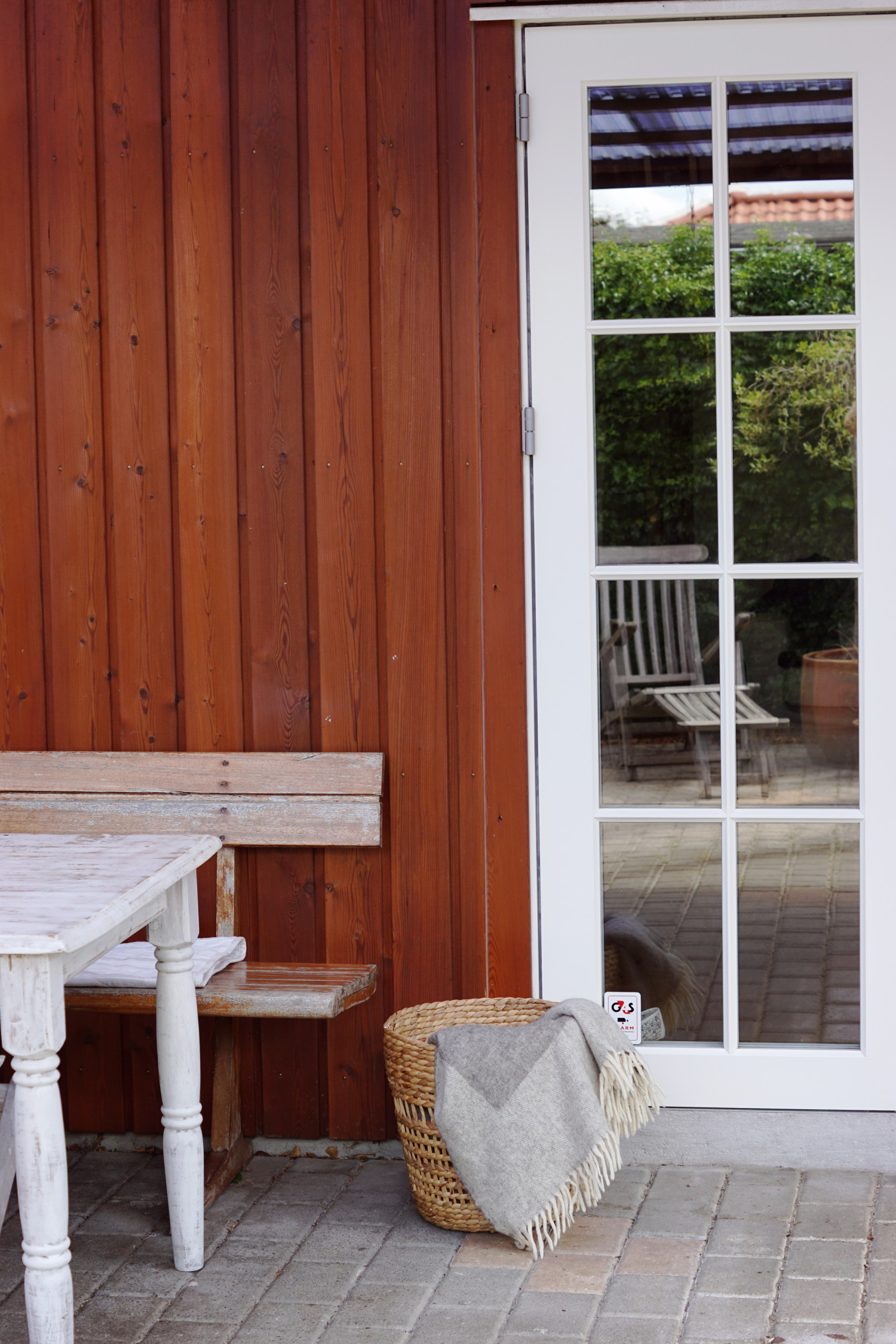 Bænken langs huset er en gammel skolebænk, som jeg har overtaget fra mine forældre, som har arvet den fra mine oldeforældre. Den er ca. 100 år gammel og den er jeg SÅ glad for og passer godt på – så den står i læ for regn og slud helt inde langs huset.