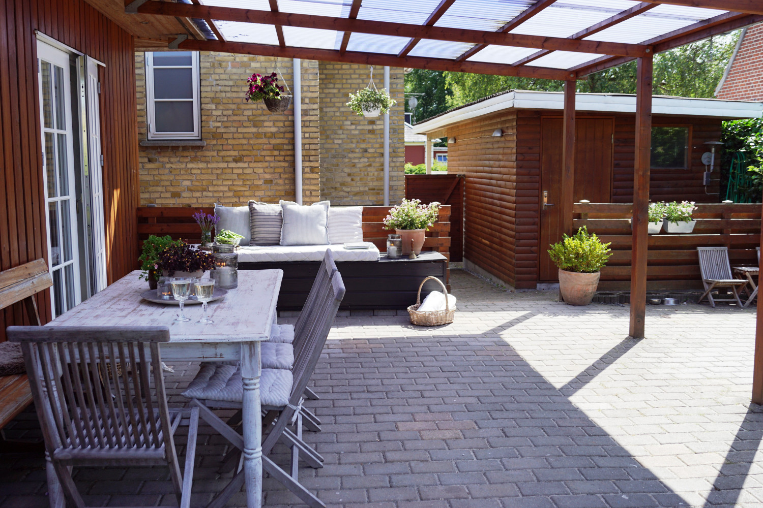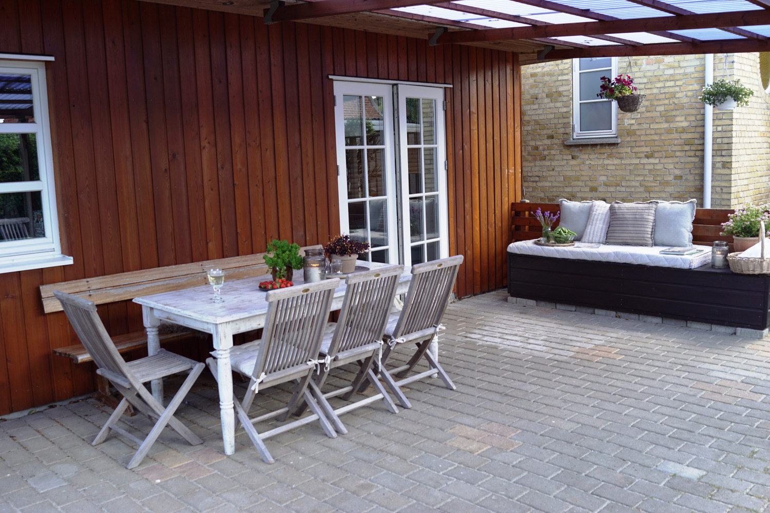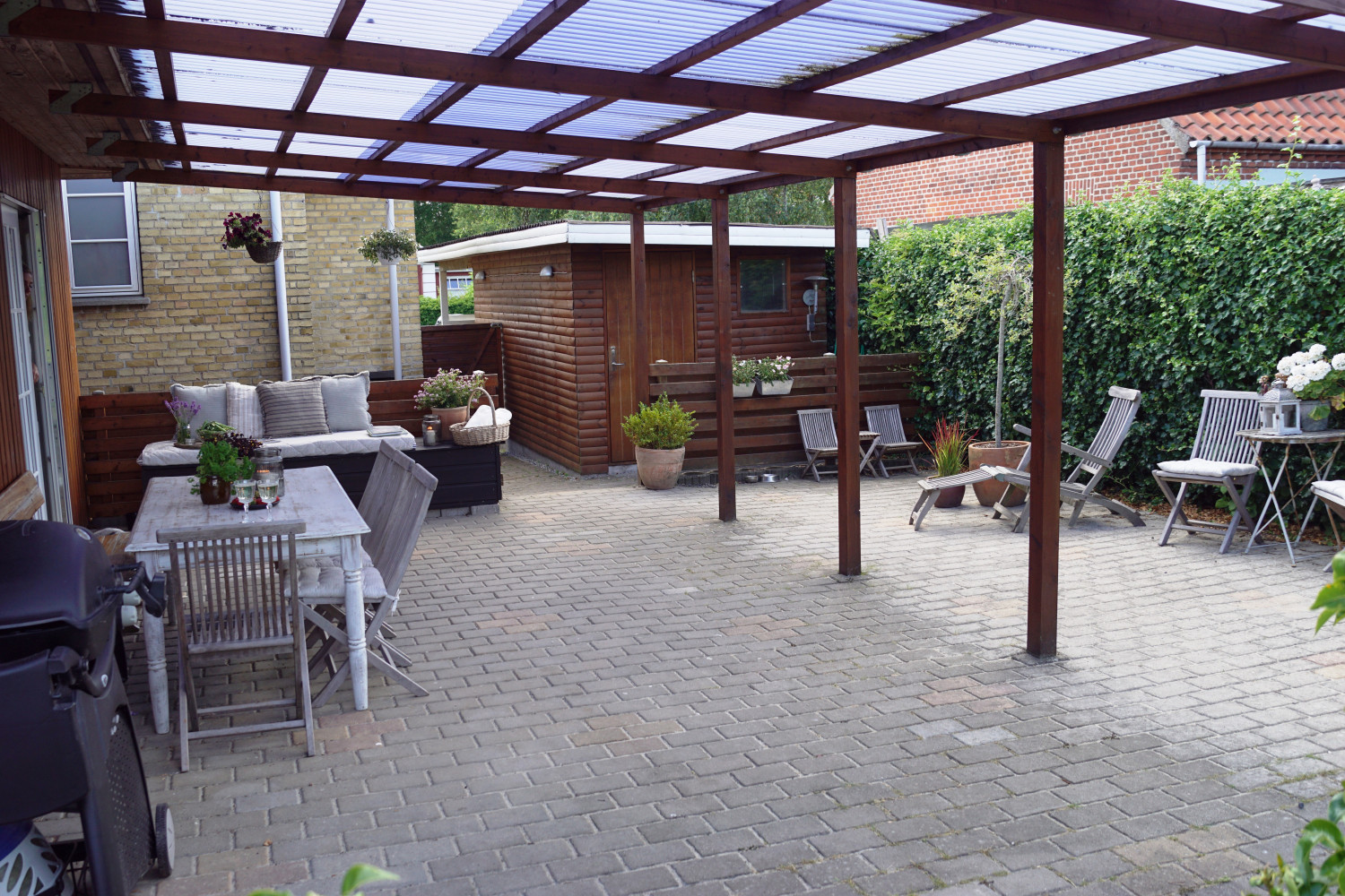 Hele sommerhalvåret er der ikke noget mere fantastisk end at kunne slå dørene op til vores fantastiske store overdækkede terrasse. Huset får nærmest et ekstra rum, og hus og have bliver takket være denne terrasse bundet helt unikt sammen. Den er bygget op mod husets tilbygning og var én af de ting vi særligt faldt for ved huset.