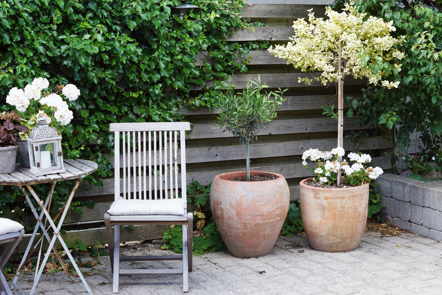 En af de ting jeg især elsker ved dette område (og vores have generelt) er at alle havemøbler og krukker er fra mit barndomshjem. Mange af de blomster og de to træer i krukkerne er faktisk blevet transporteret helt fra min barndomshave i det østjyske til Københavns forstad. De har stået i 15-20 år med netop det piletræ og de hortensiaer i. Bare i haven i mit barndomshjem.