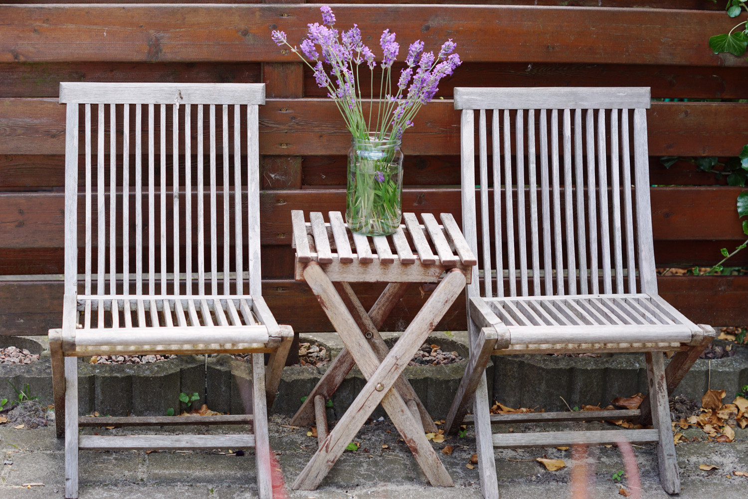 Stolene langs bordet har vi overtaget fra mit barndomshjem. De er af mærket “L. T. Collection” og er i teaktræ der har fået lov at stå ubehandlet. Deraf den lysegrå farve, som jeg virkelig godt kan lide (og som er praktisk fordi stolene aldrig skal behandles med olie eller males). De øvrige møbler på terrassen har fået lov at stå på samme måde.