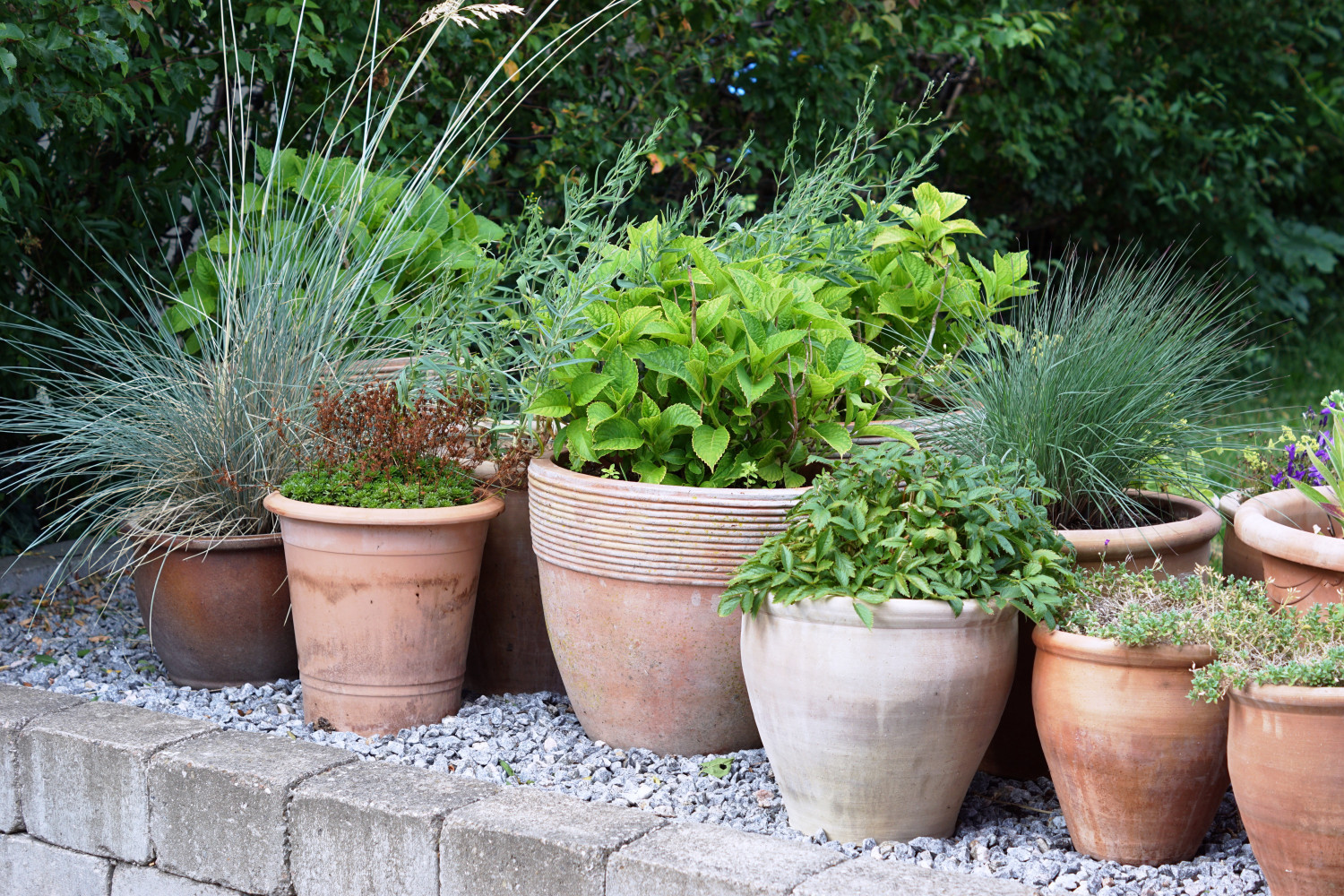Terrassen afgrænses fra haven med et stenbed med masser af stauder og prydgræsser.