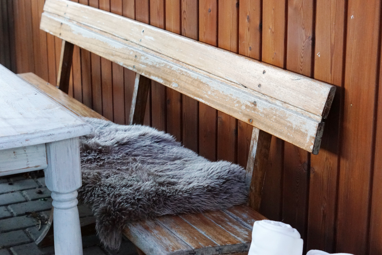 Spisebordet efterlod tidligere ejer til os. Det havde været deres spisebord i køkkenet, og de var så flinke at lade det stå, da vi i august 2018 overtog nøglerne til huset, og i starten ingen møbler havde med. Da det jo var sommer (og hele huset indvendigt i øvrigt var ved at få lagt nye gulve, malere var i gang med væggene osv.) flyttede vi det ud på terrassen. Og der har det stået lige siden. Jeg synes det er et ganske charmerende bord med den hvide kalkmaling der er skallet af mange steder. Det giver bordet et smukt, patineret udtryk.