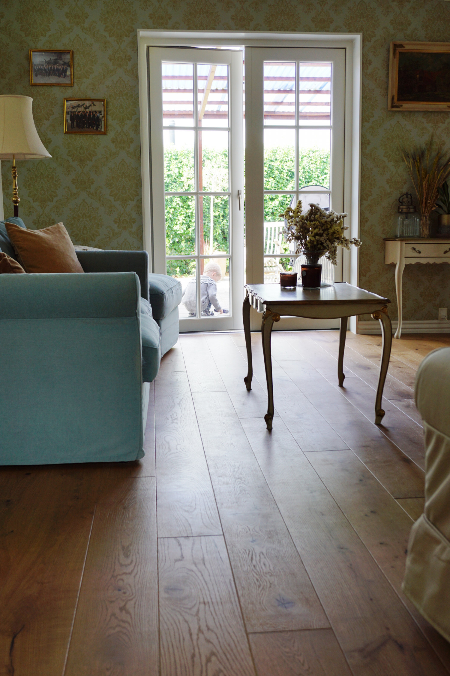 Døren ud til står næsten åben alle timer om dagen, så både barn og hund kan løbe frem og tilbage mellem hus og have som de vil. Ofte sidder vores søn på 5 år (og besøgende legekammerater) ude på fliserne og leger – så bliver legetøjet fra værelset taget med ud og der bliver bygget togbaner eller safarilandskab udenfor.