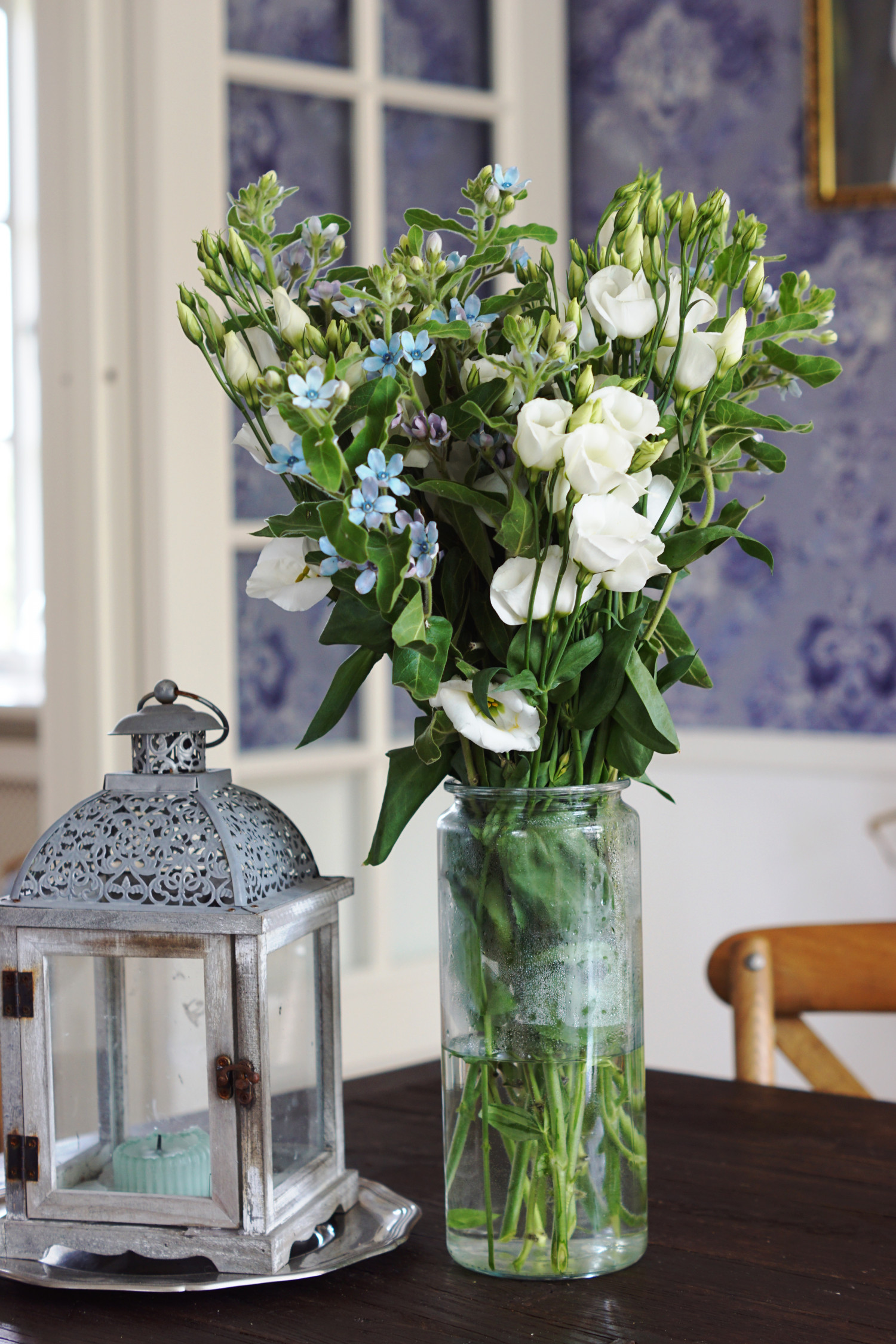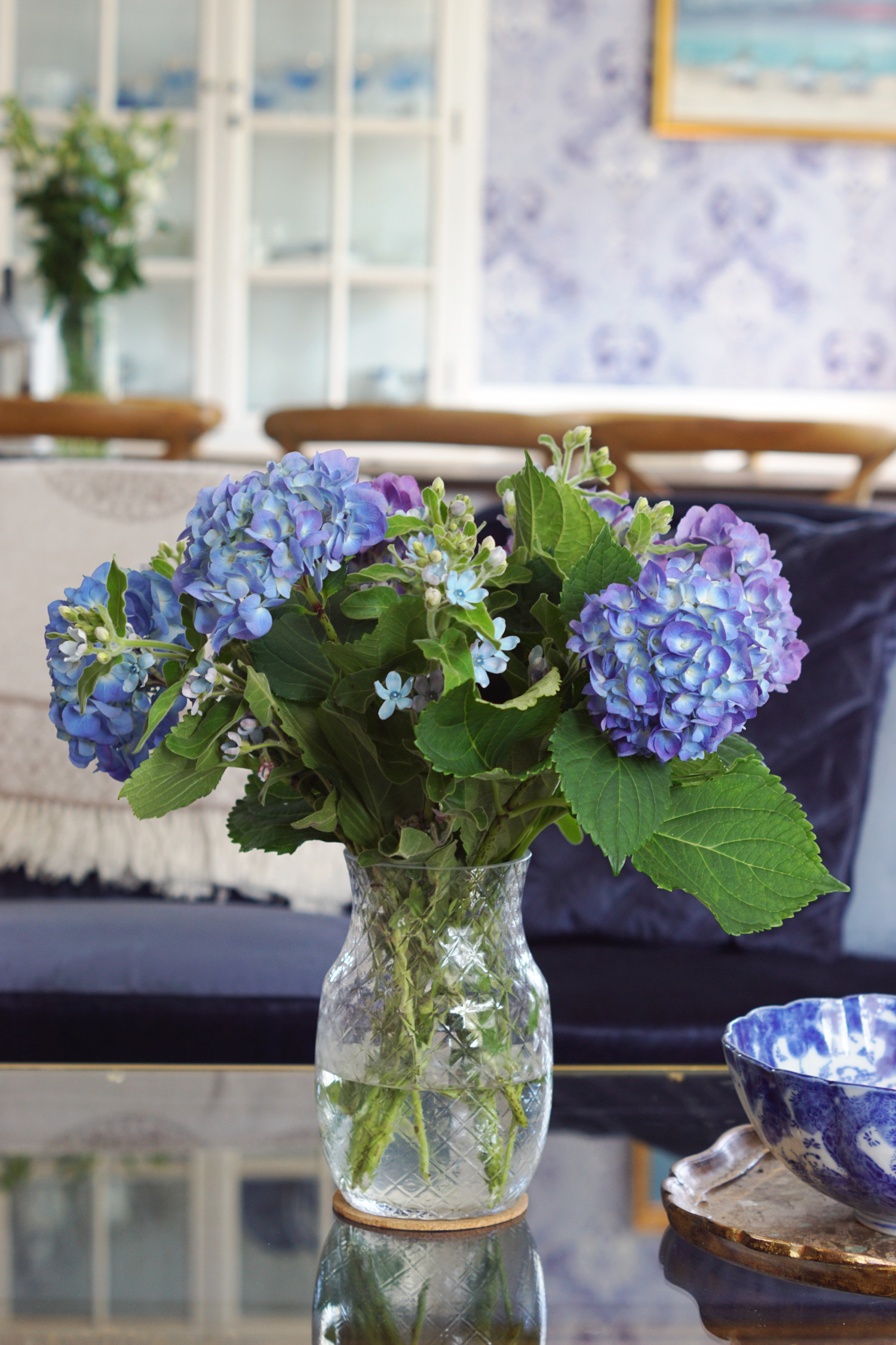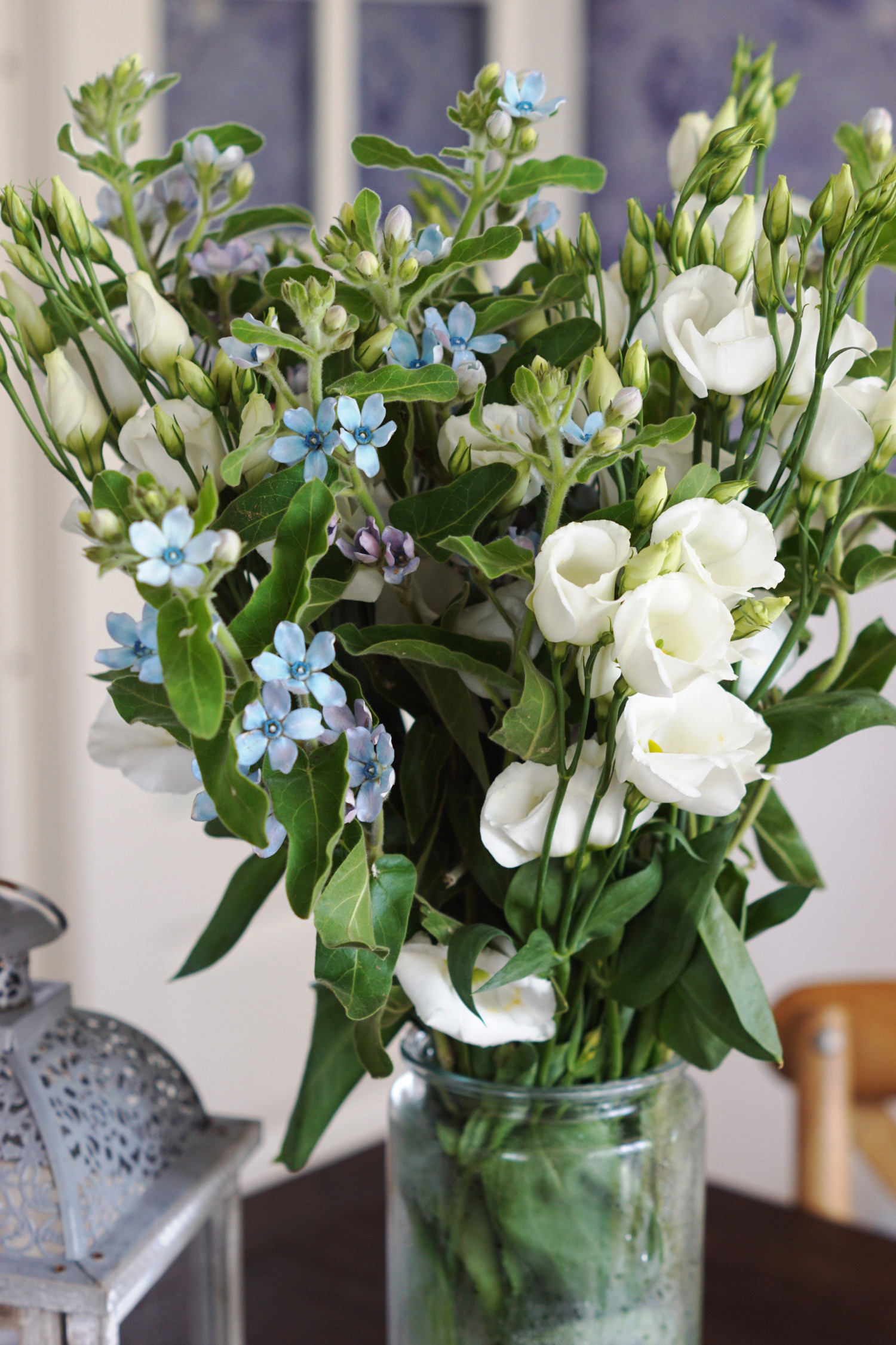 Her er det blå og hvide blomster som passer smukt ind i vores blå stues farver og elegante indretning. Min mand kom den anden dag hjem og overraskede mig med 3 bundter blomster:
