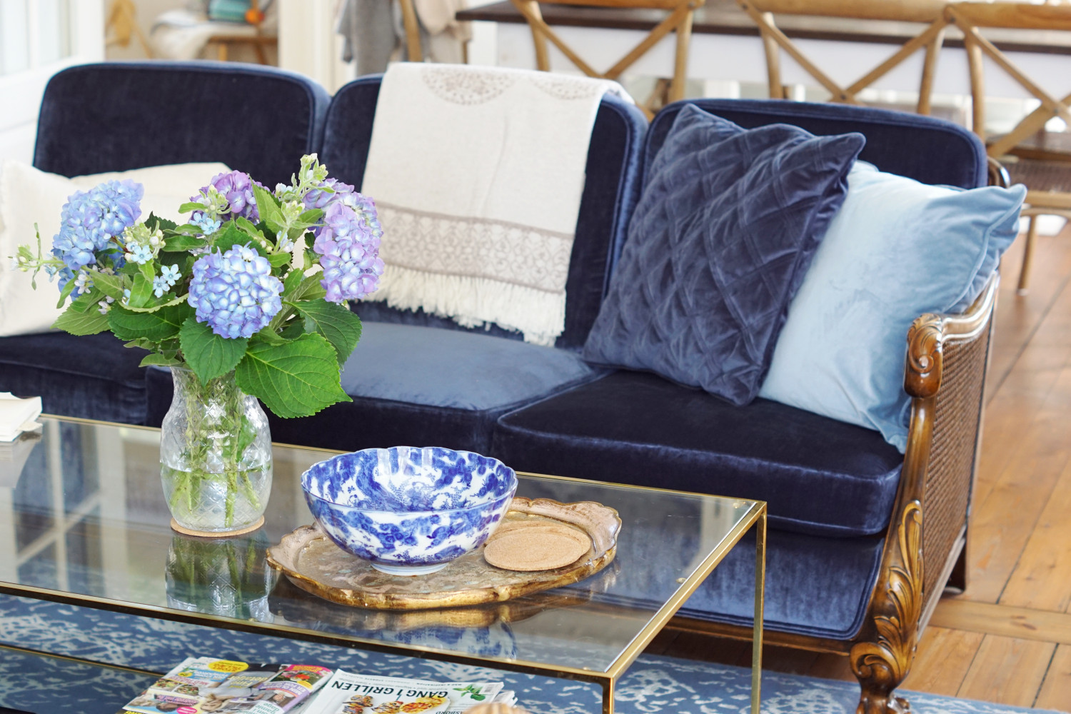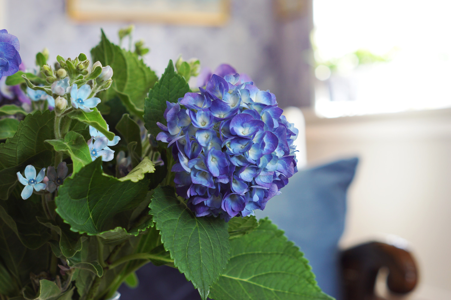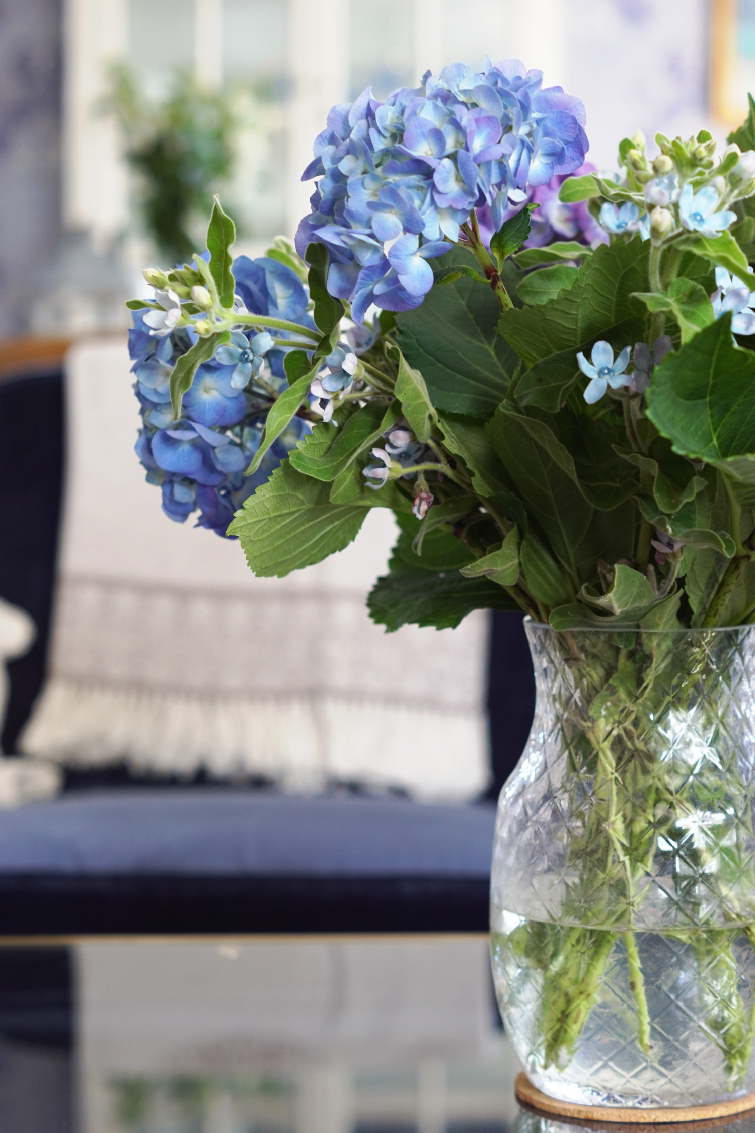 Her er det blå og hvide blomster som passer smukt ind i vores blå stues farver og elegante indretning. Min mand kom den anden dag hjem og overraskede mig med 3 bundter blomster: