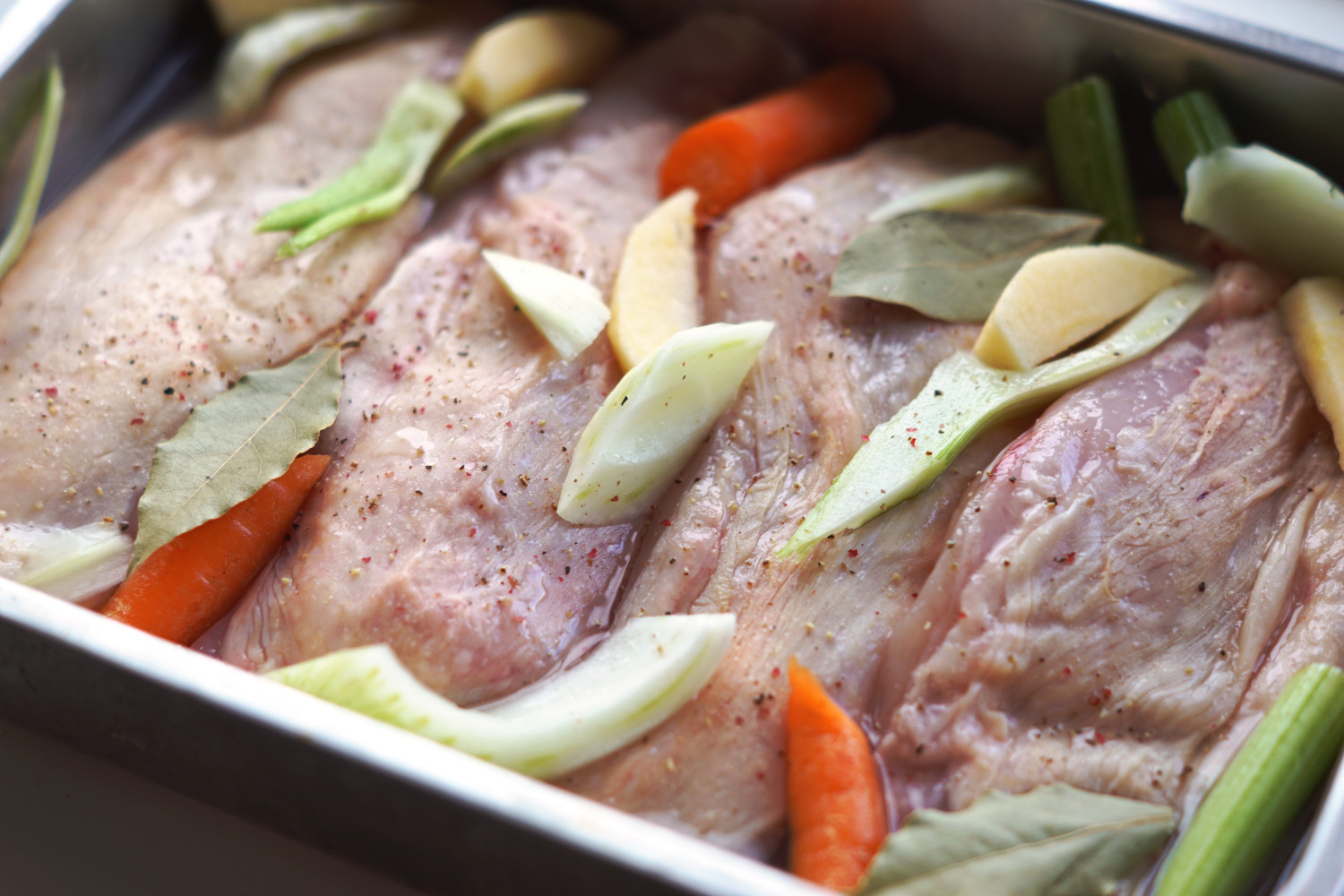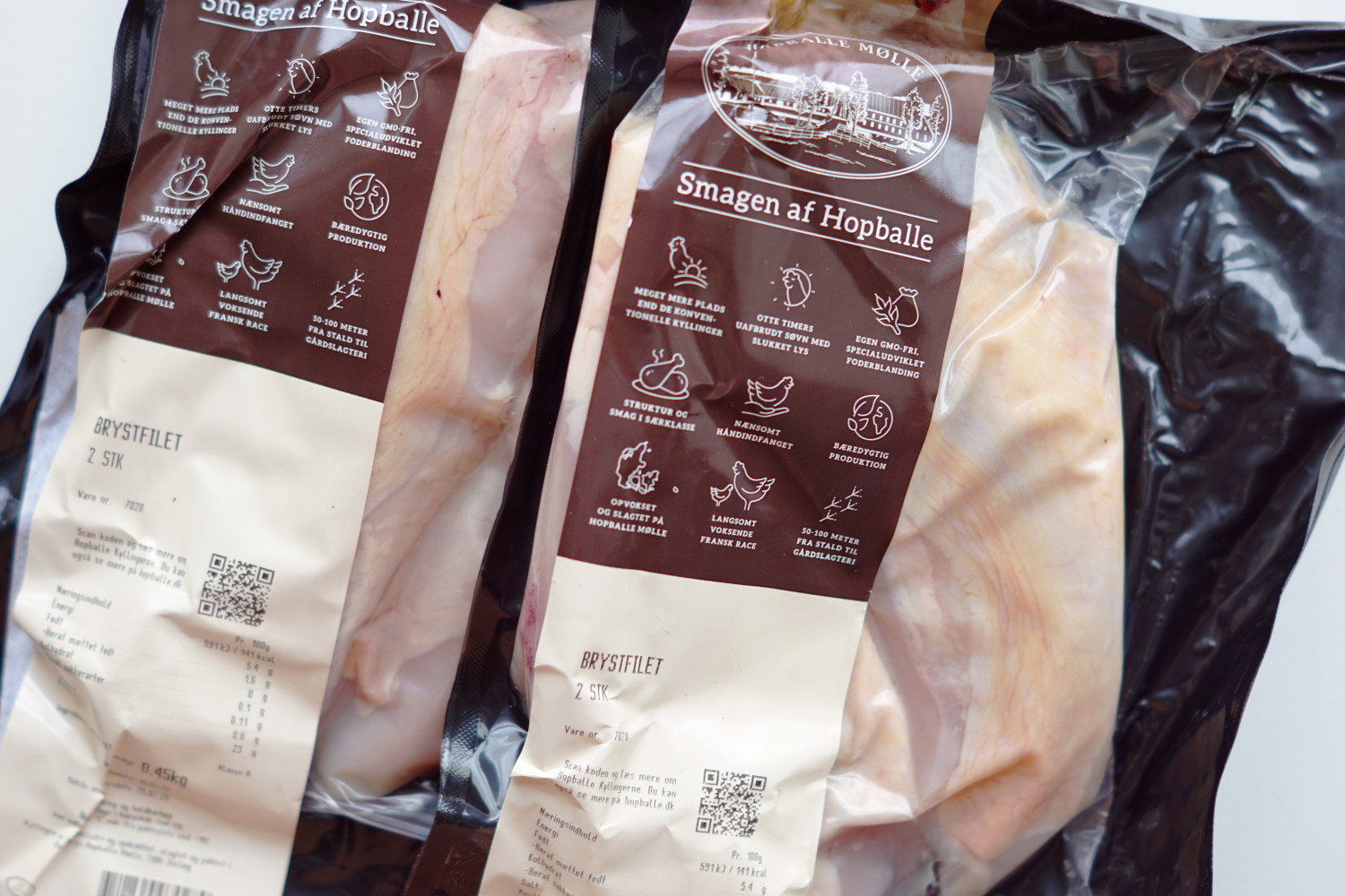 Det kan være svært at fine kyllingebryst med skindet på og som ikke er pumpet fuld af vand. Jeg har brugt kylling fra Hopballe Mølle, som simpelthen er et vanvittigt lækkert stykke kød.