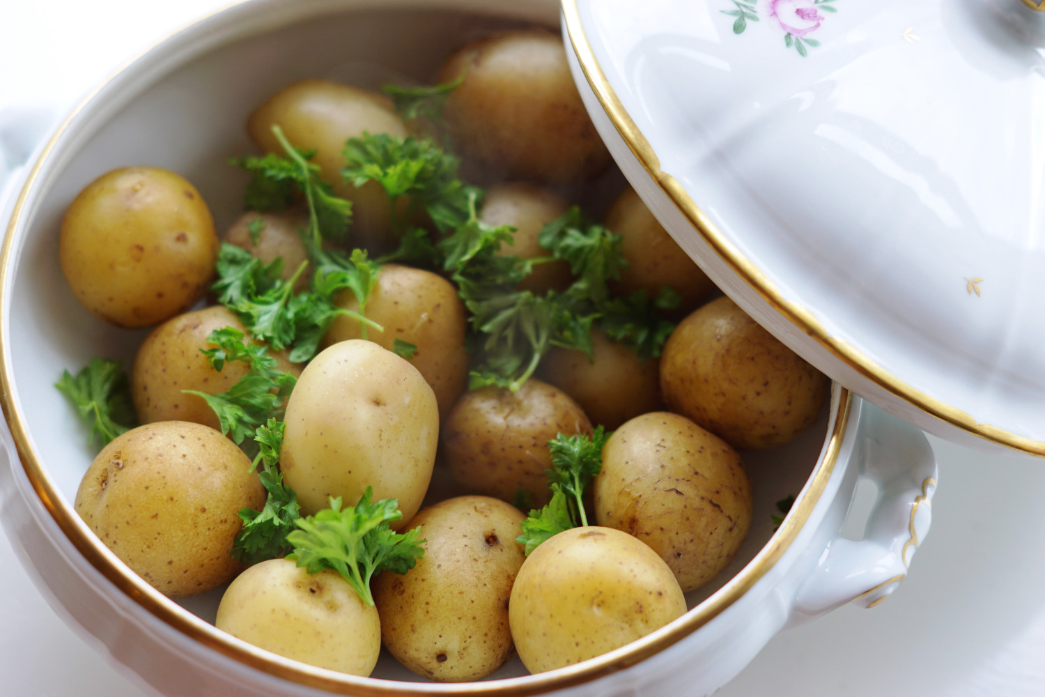 Hvis du skal servere retten som her med små nye kartofler til, sætter du kartoflerne til at koge i letsaltet vand imens kyllingen er i ovnen. Når kartoflerne er færdige (prik dem med en kødnål) tages de af varmen, vandet hældes fra og der lægges et stykke køkkenrulle over kartoflerne i gryden, som der endeligt sættes låg på. Pak gryden ind i et håndklæde, så kartoflerne holder sig varme.