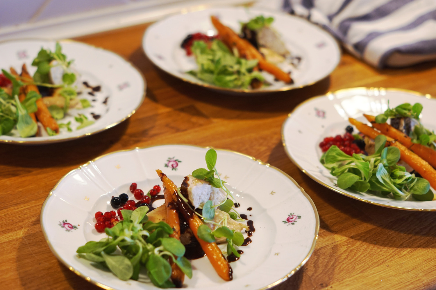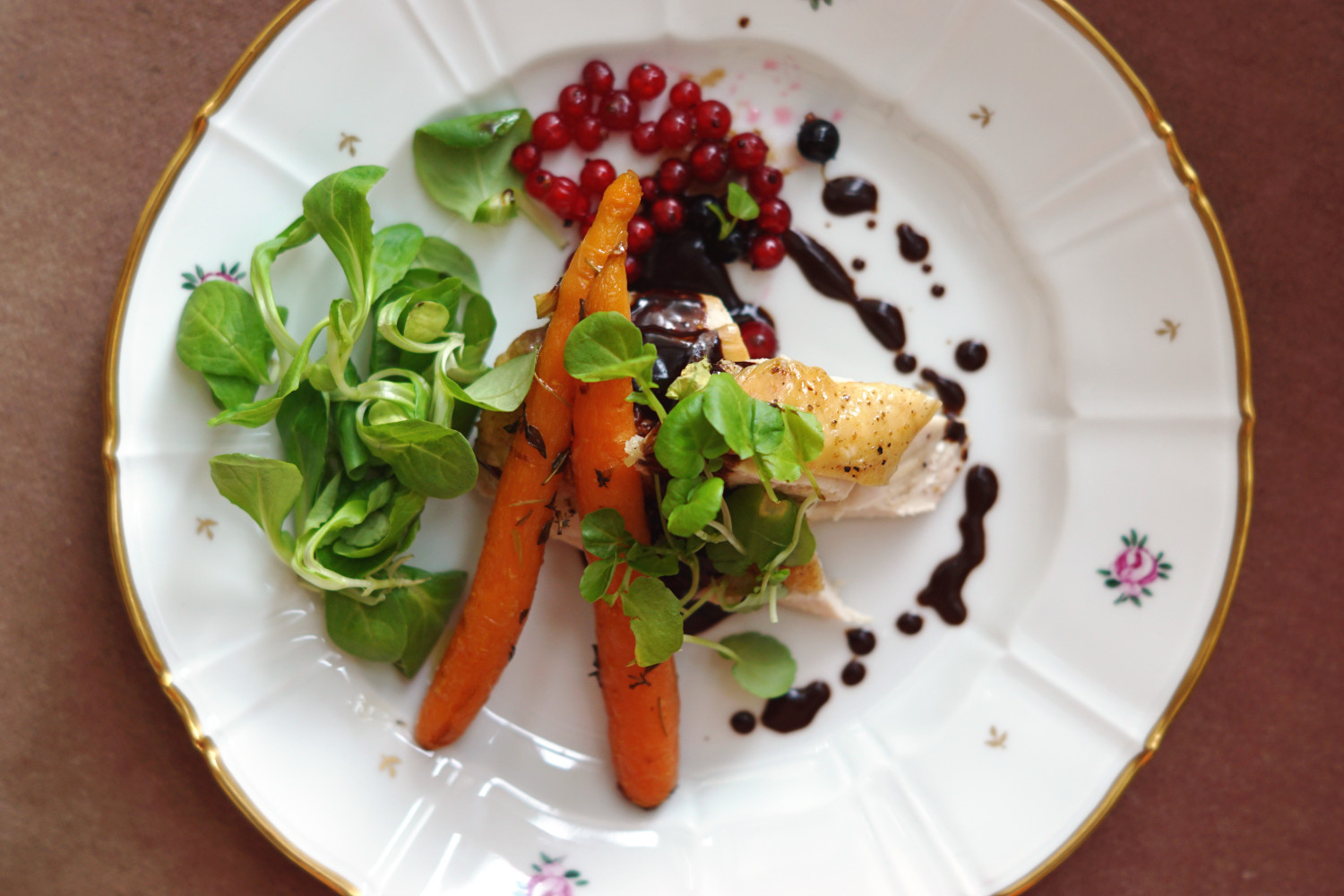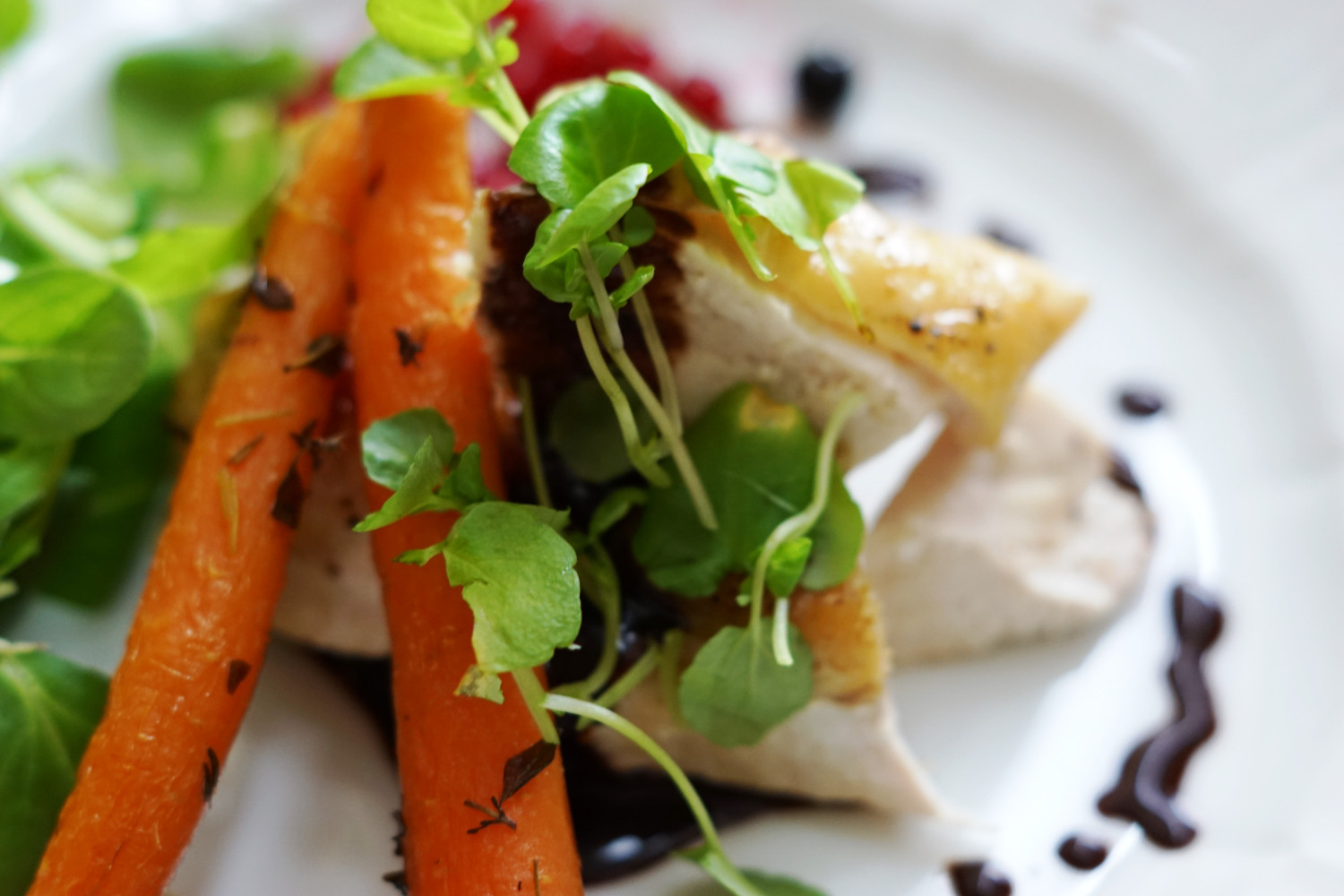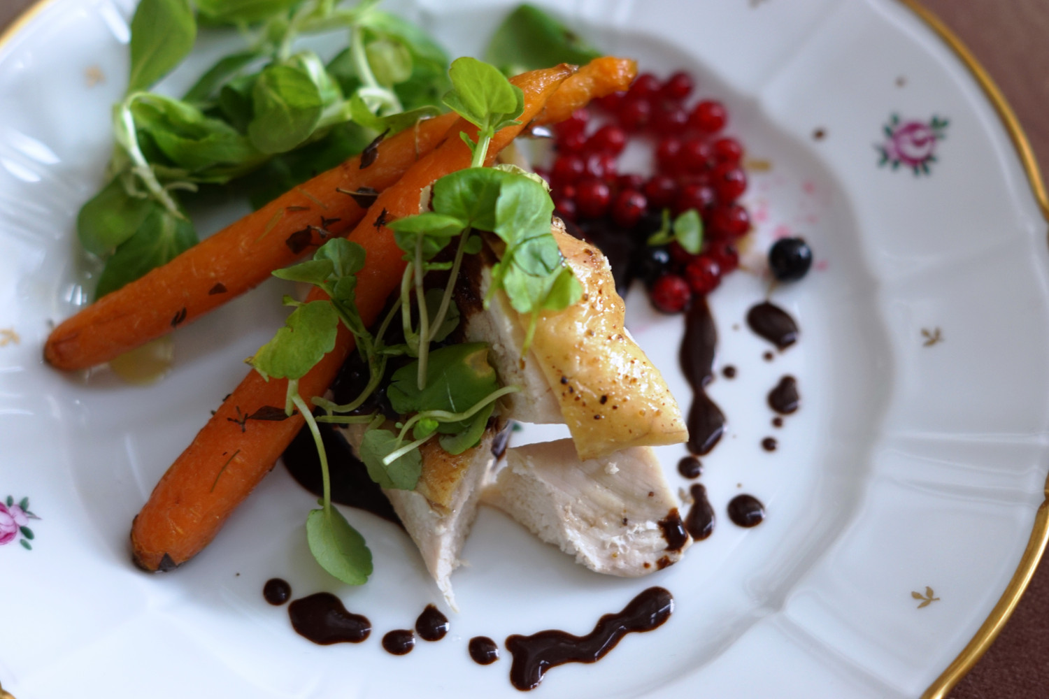 En god hovedret indeholder for mig både noget sødt, syrligt, fedt, frisk, sprødhed og umamismag. Dette lever denne ret til fulde op til – den har det søde fra gulerødderne, det syrlige fra ribsene/solbærene, det fede fra kyllingeskindet, det friske og sprøde salaten/brøndkarsen og umamismagen fra hønsesaucen.