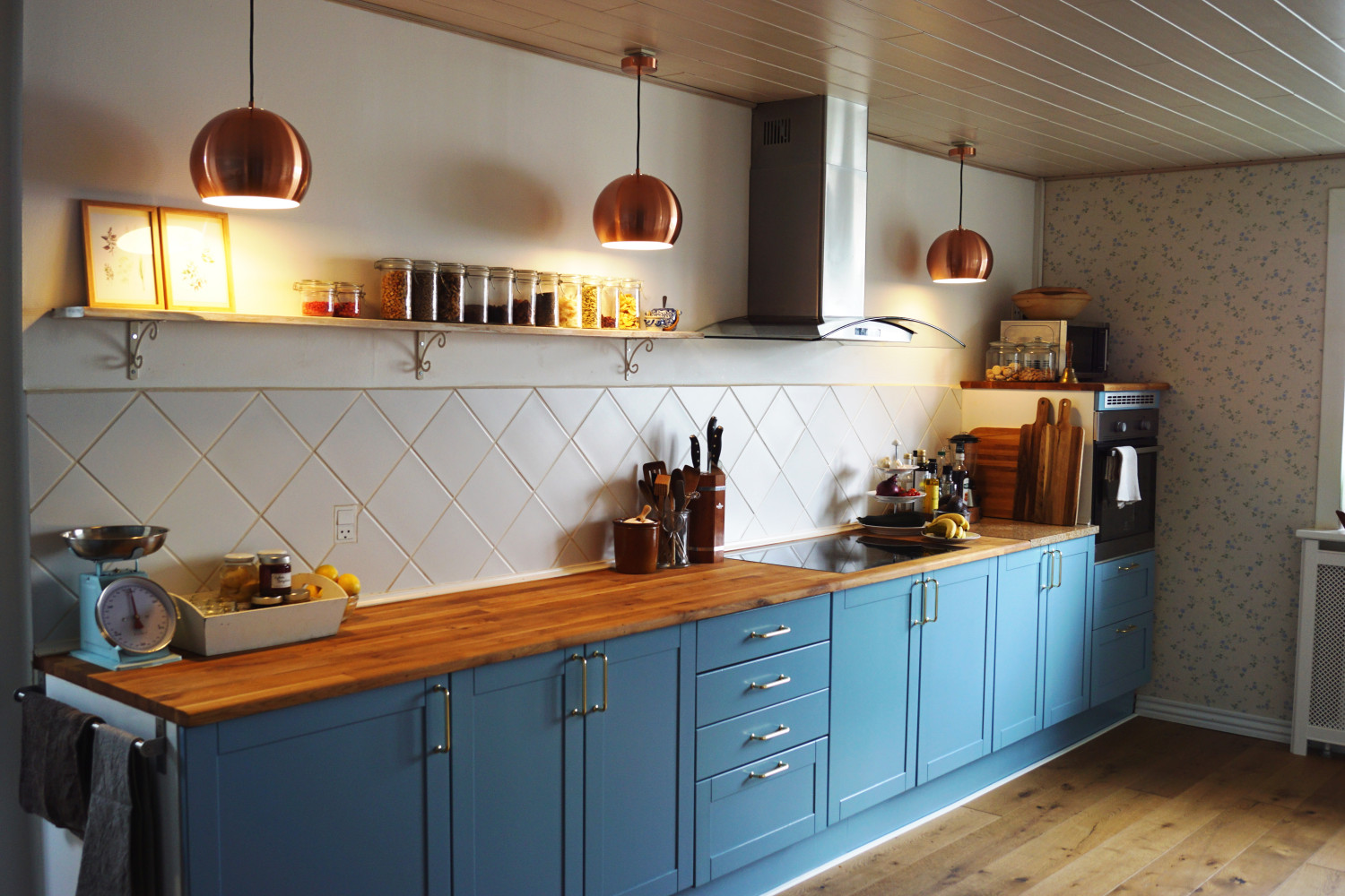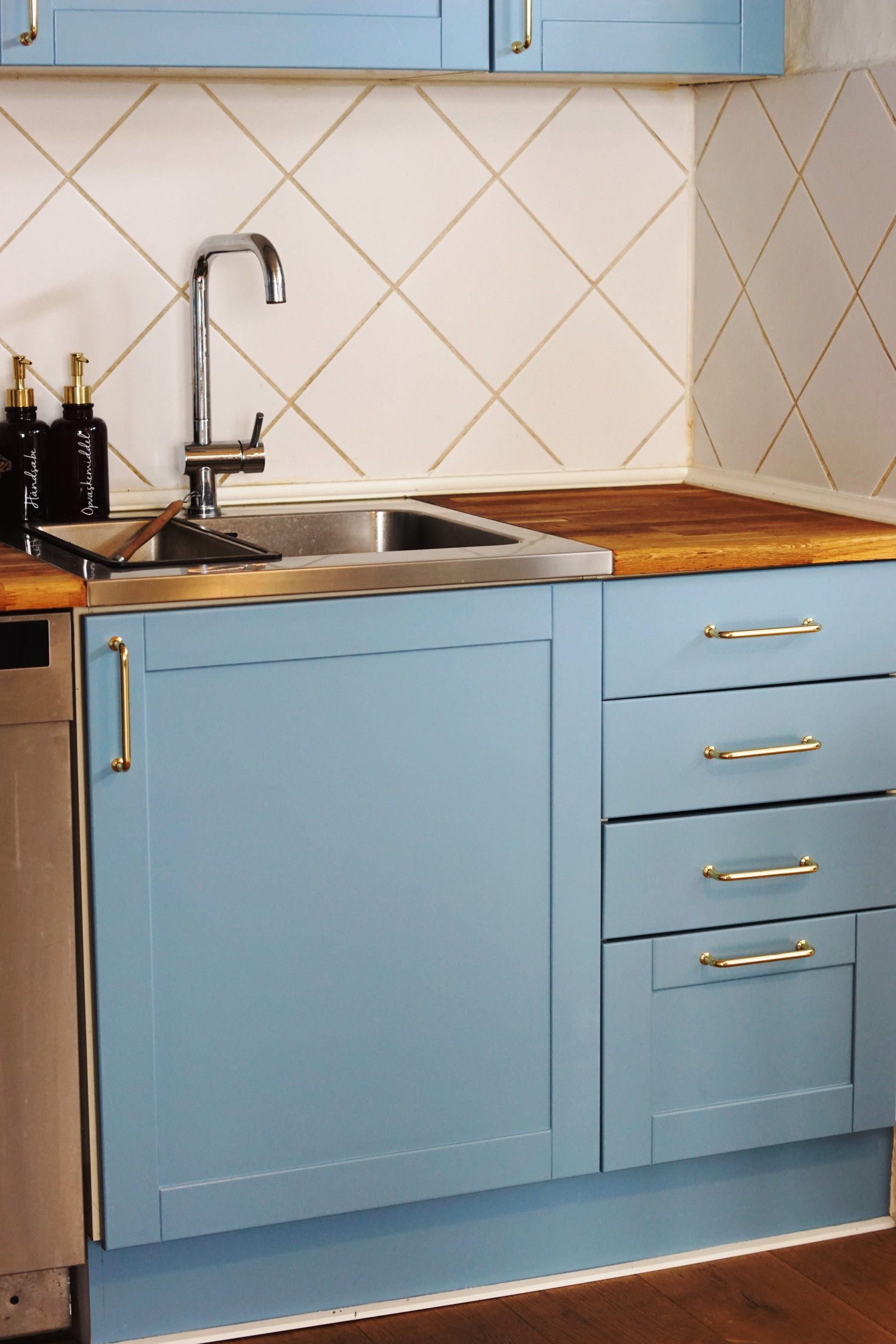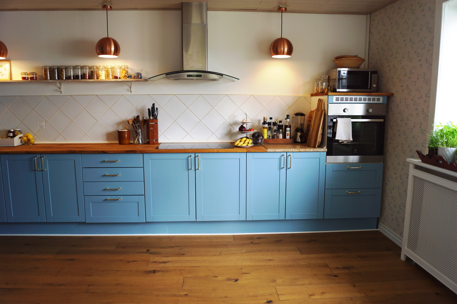 Få et kig ind i mit landlige forstadskøkken, som er et gammelt IKEA-køkken jeg har “shinet op” ved at give lågerne en petroleumsblå farve, nye greb i messing look og masser af varme og hyggelige detaljer.