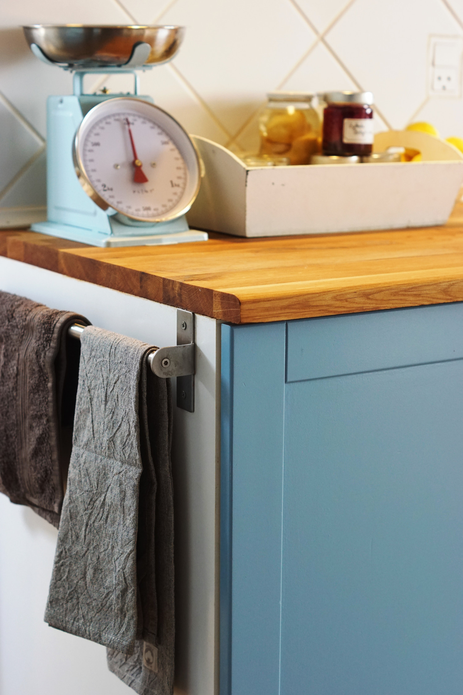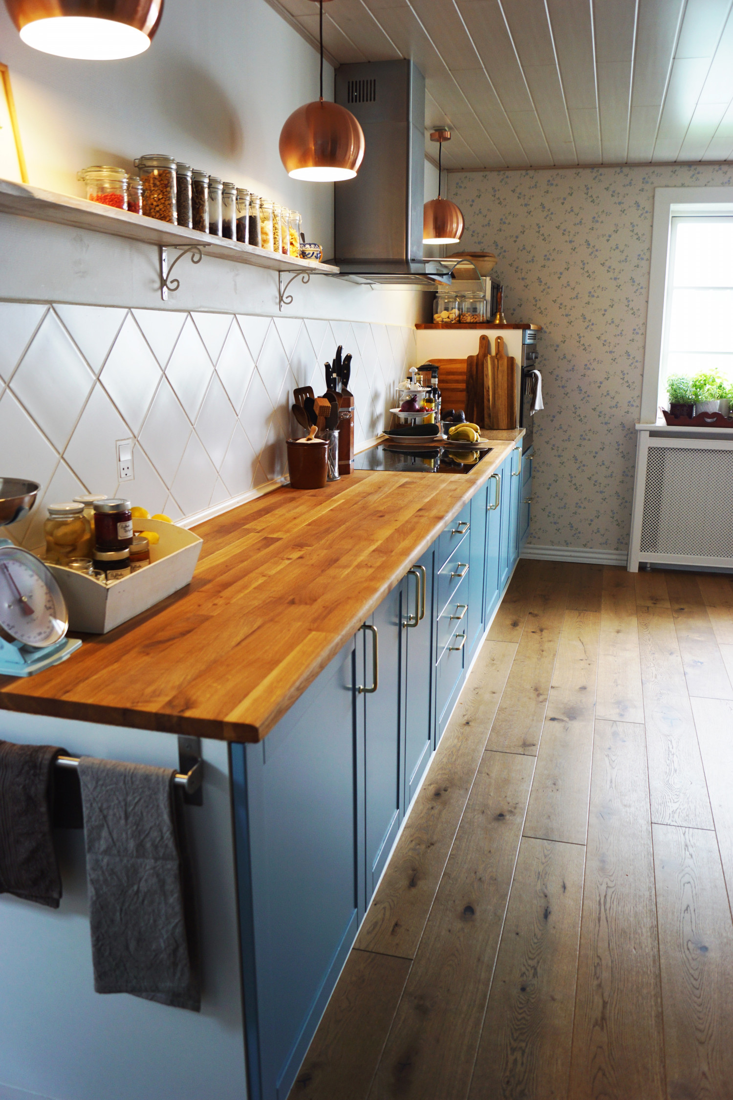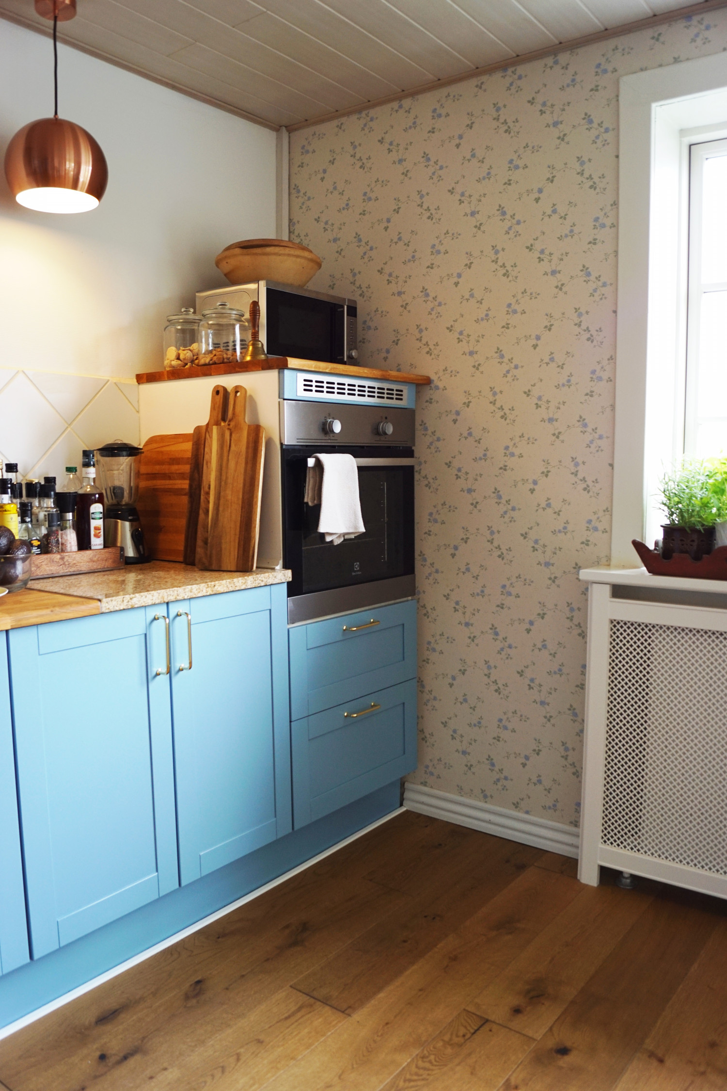 Få et kig ind i mit landlige forstadskøkken, som er et gammelt IKEA-køkken jeg har “shinet op” ved at give lågerne en petroleumsblå farve, nye greb i messing look og masser af varme og hyggelige detaljer.