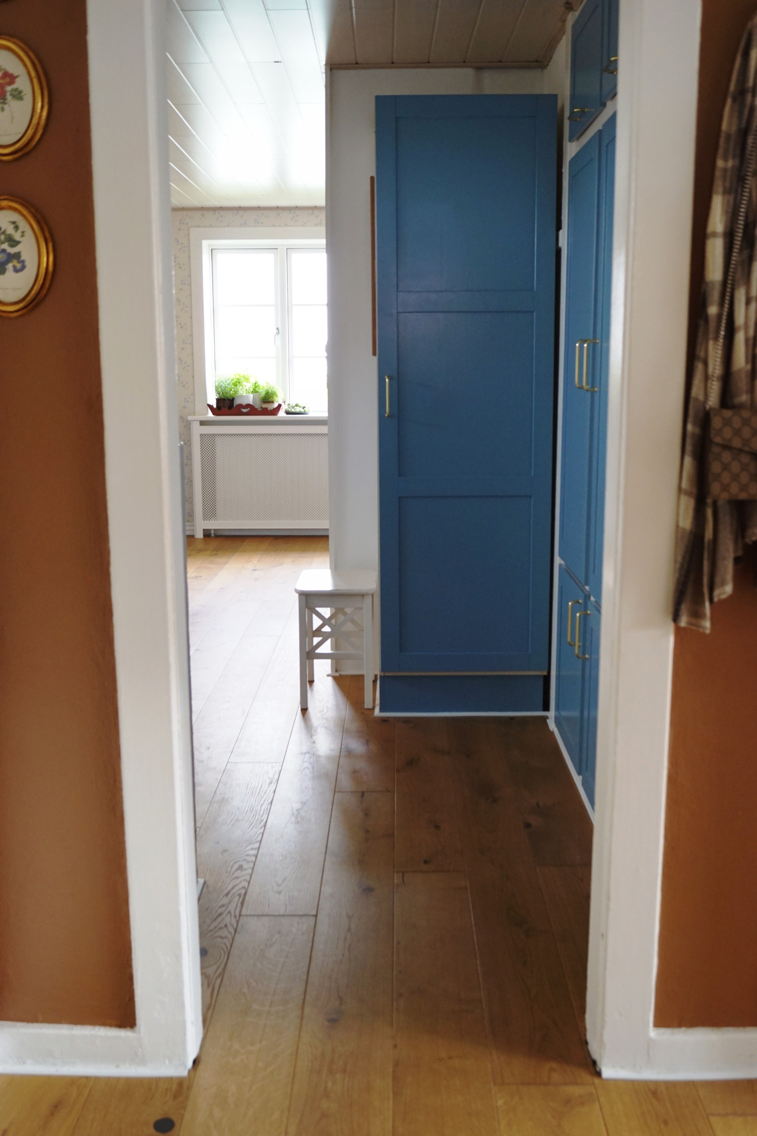 Stolen i hjørnet har jeg malet i samme blå farve som køkkenet.