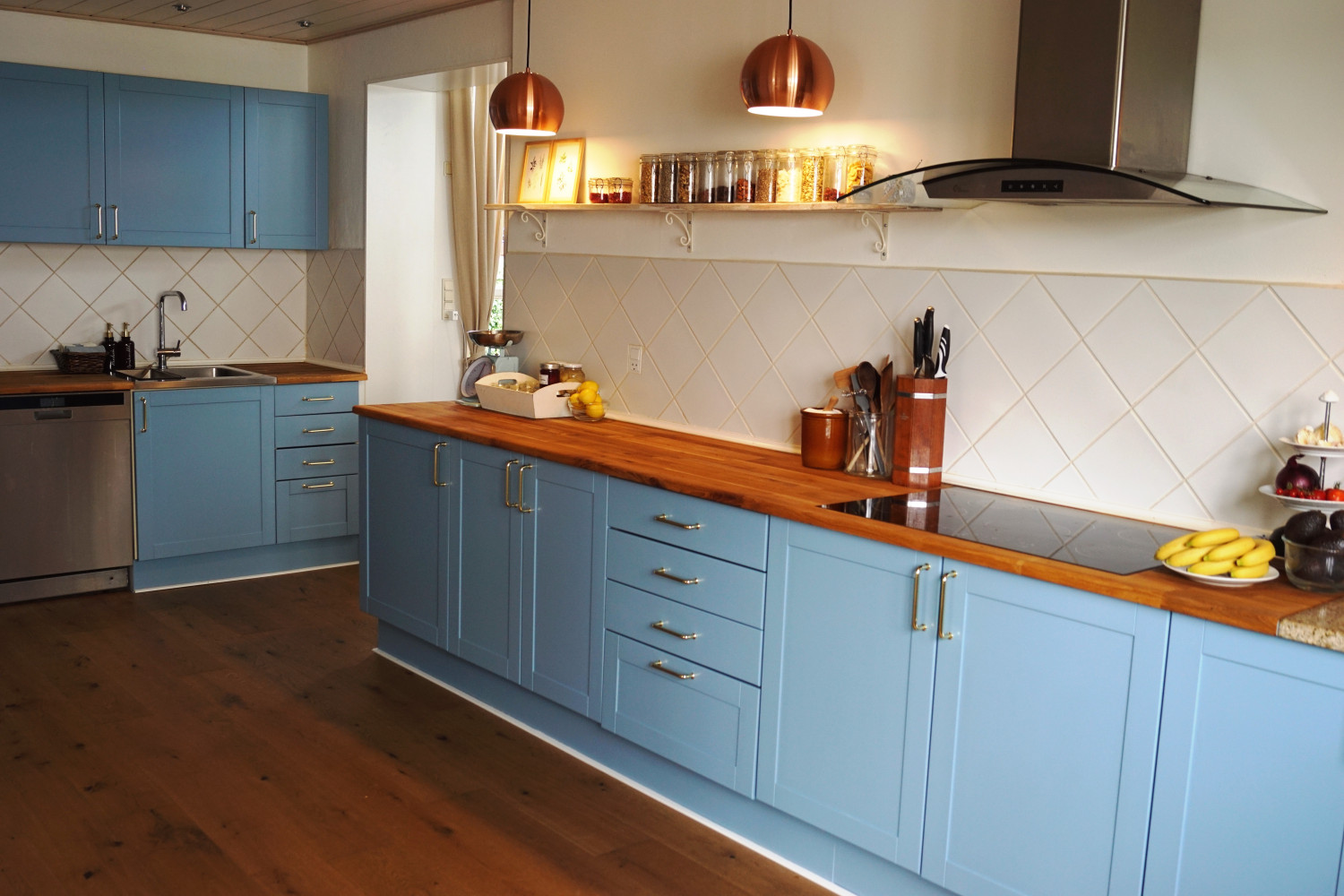 Vi er lige flyttet ( 1 år siden) ud af byen og 30 min på motorvejen ud hvor der er marker og masser af plads og højt til loftet, til både min søn og børnebørn ( lige om hjørnet). Jeg er en total “gør det selv” og skal nu i gang, er startet så småt, med vores køkken. Det burde skiftes ud men det er der slet ik penge til. Så jeg er hoppet den samme metode som dig og er stødt på det ene problem efter det andet. Det største er emhætten. Den var grøn ( ikke en pæn grøn) og den lød som en flyvemaskine der lettede hver gang jeg tændte den. Jeg tænkte jeg bare ku købe en ny pæn hvid en. Men nej for så passer den krydderi hylde som hænger over, slet ikke.
