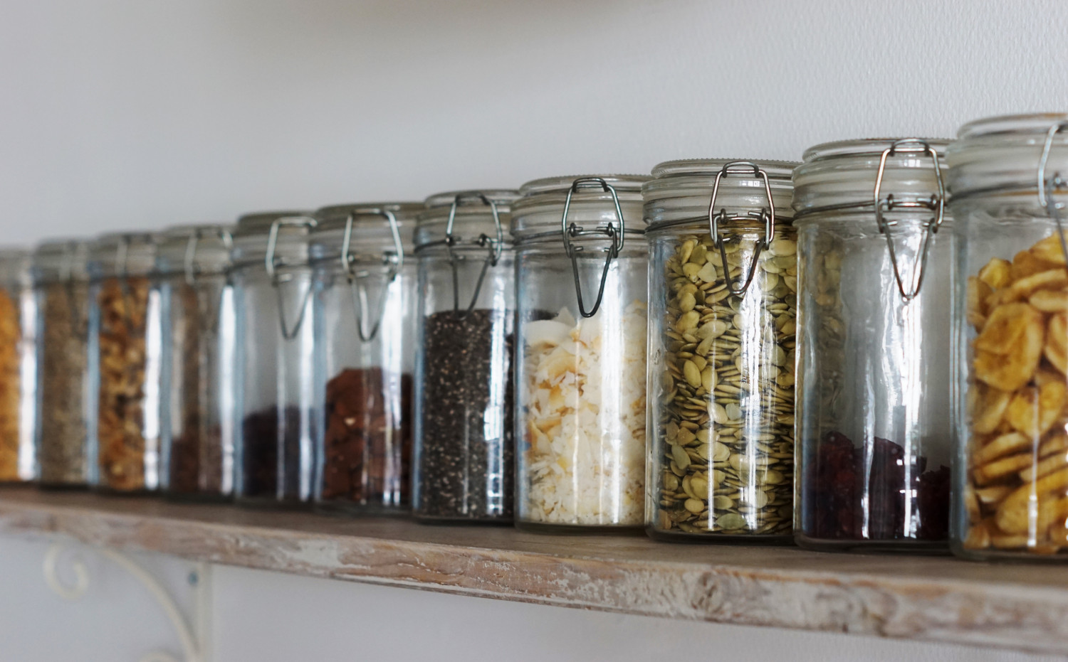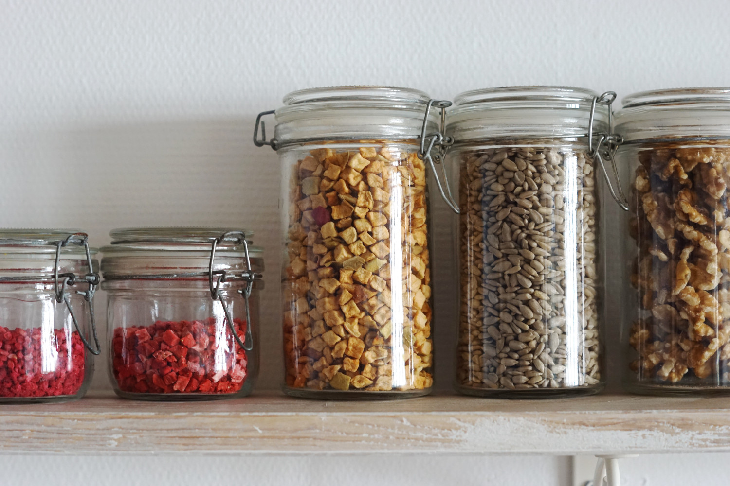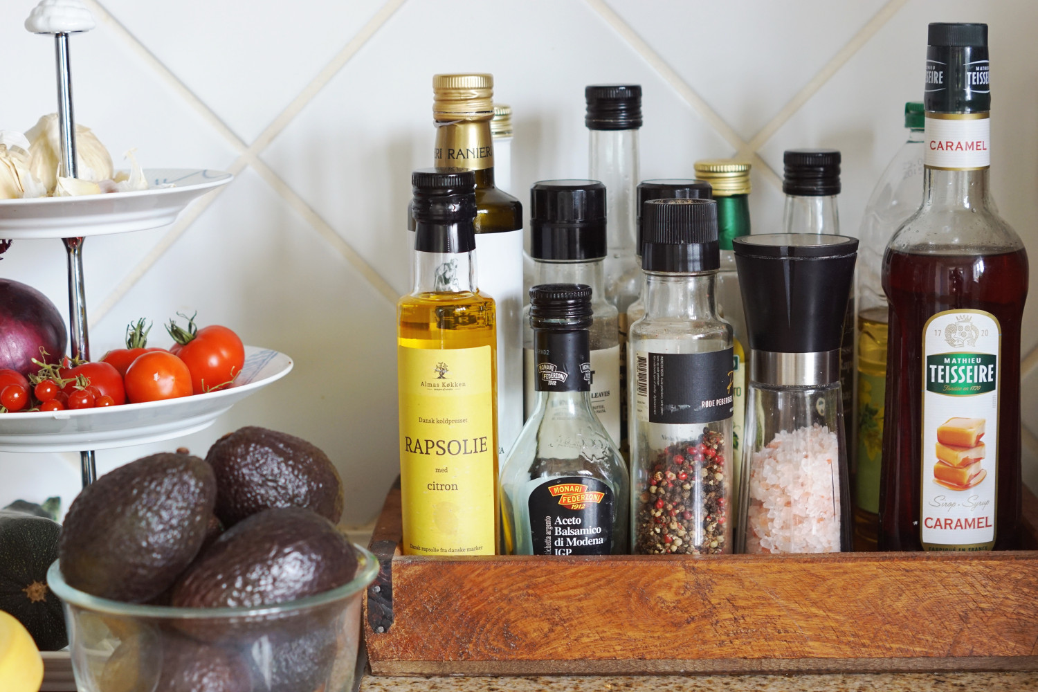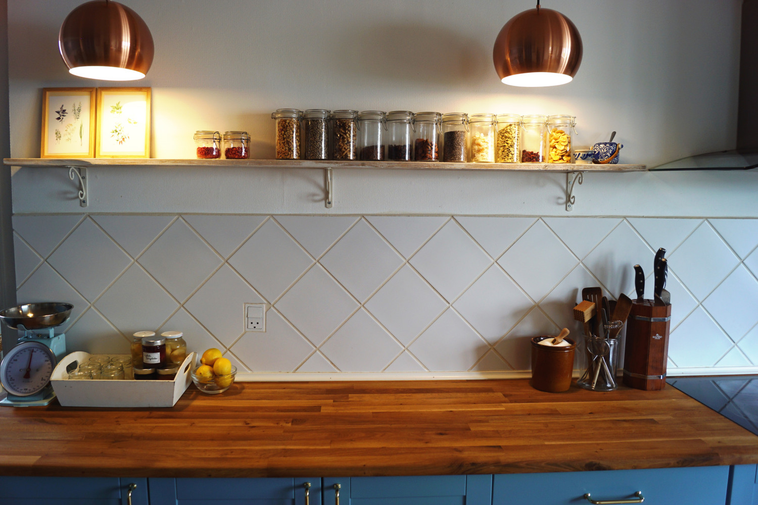 Mad fylder meget i mit køkken, og jeg elsker at have forskellige ingredienser og råvarer stående fremme så jeg lynhurtigt kan blive inspireret og bruge det i min madlavning. Hylden med de mange nødder og kerner på er ikke bare yndig at se på, den er også ganske funktionel, fordi tingene er nemme at gribe ud efter og de fyldte glas betyder at jeg nemt dagligt opgraderer familiens havregrød med valnødder, chiafrø og frysetørret bær.