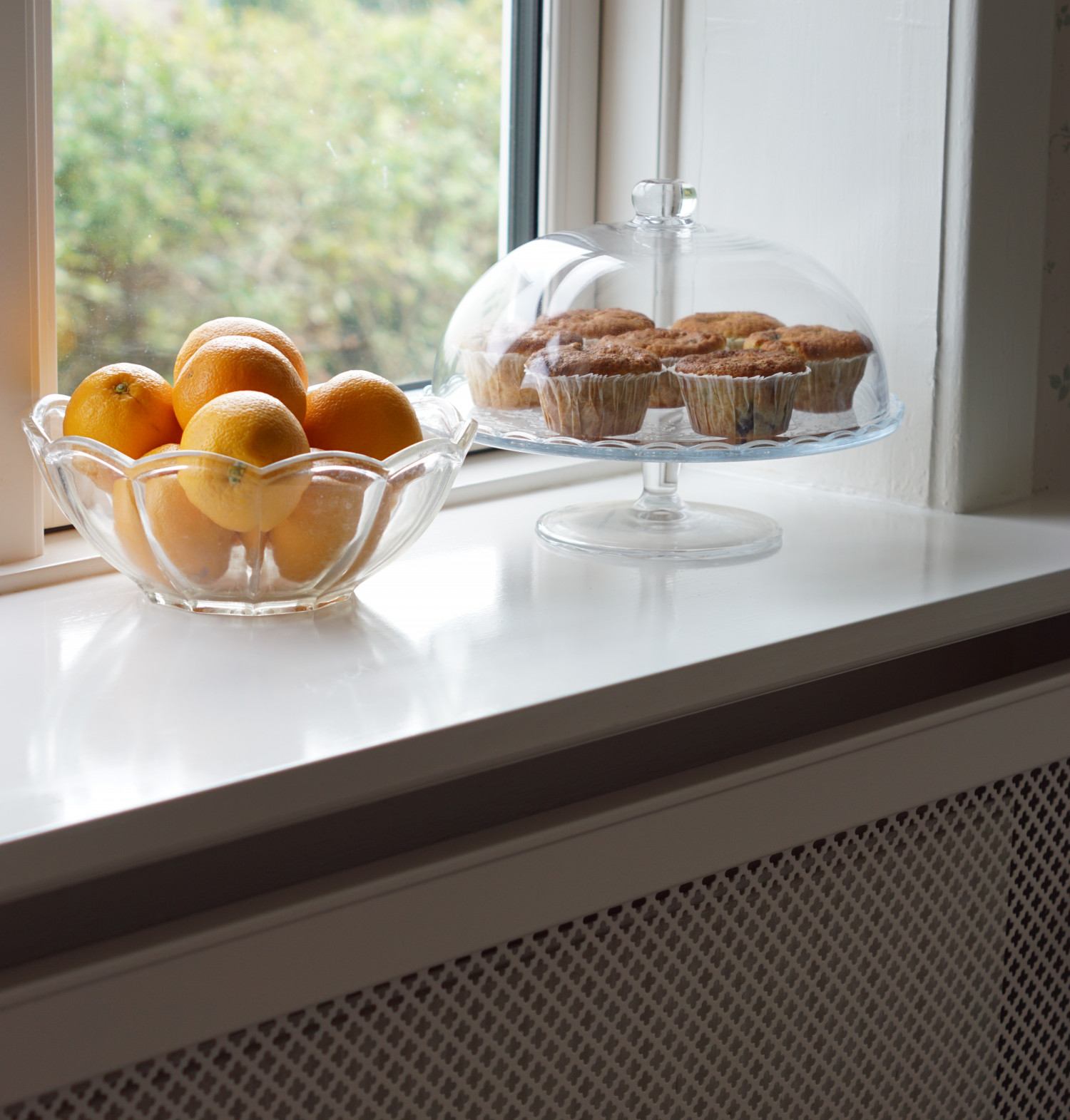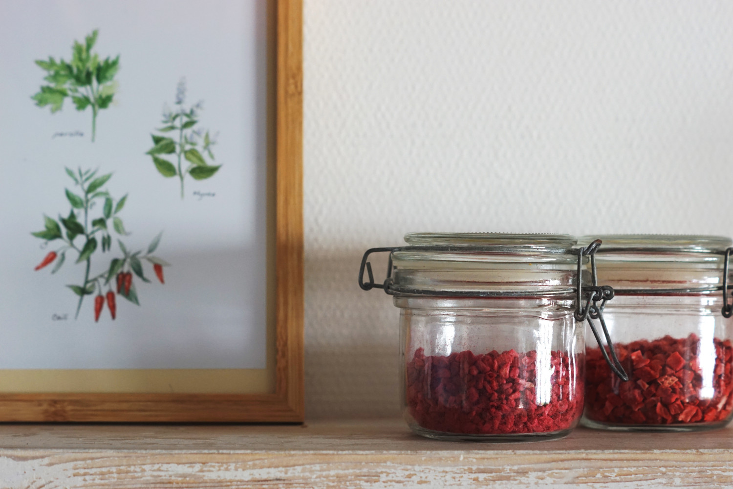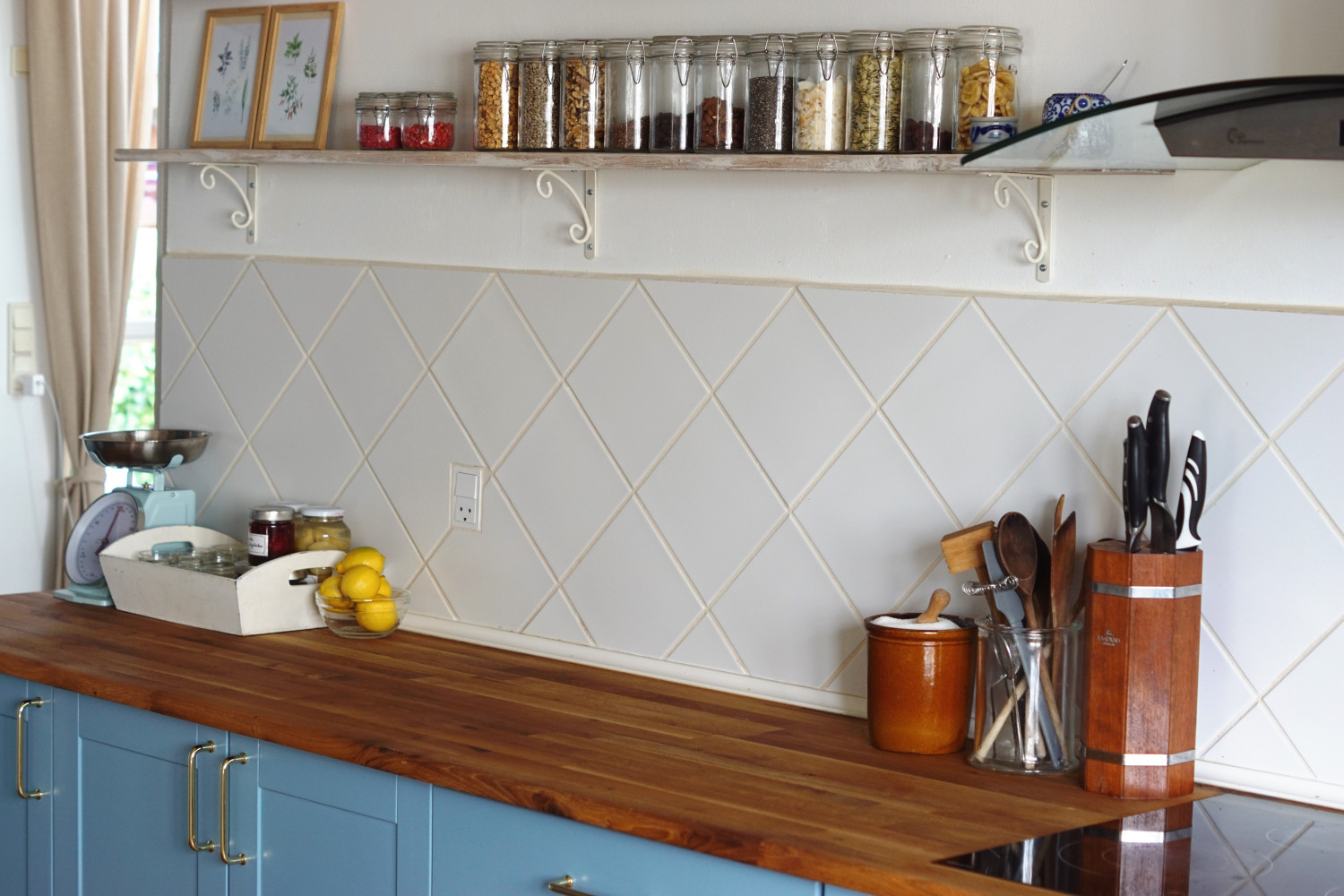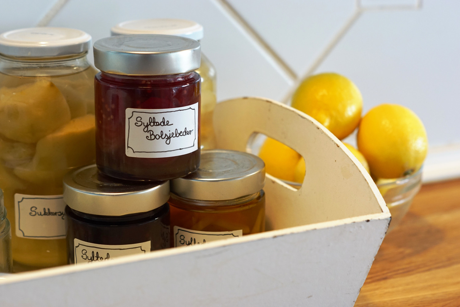Mad fylder meget i mit køkken, og jeg elsker at have forskellige ingredienser og råvarer stående fremme så jeg lynhurtigt kan blive inspireret og bruge det i min madlavning. Hylden med de mange nødder og kerner på er ikke bare yndig at se på, den er også ganske funktionel, fordi tingene er nemme at gribe ud efter og de fyldte glas betyder at jeg nemt dagligt opgraderer familiens havregrød med valnødder, chiafrø og frysetørret bær.