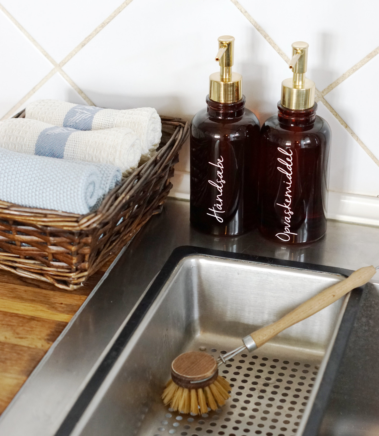 Sæbedispenserne er i glas og messinlook. De er fra CASA living og købt hos imerco. De fine labels der sidder på dem er købt hos webshoppen “pittacia”, som specialdesigner labels i forskellige skrifttyper.