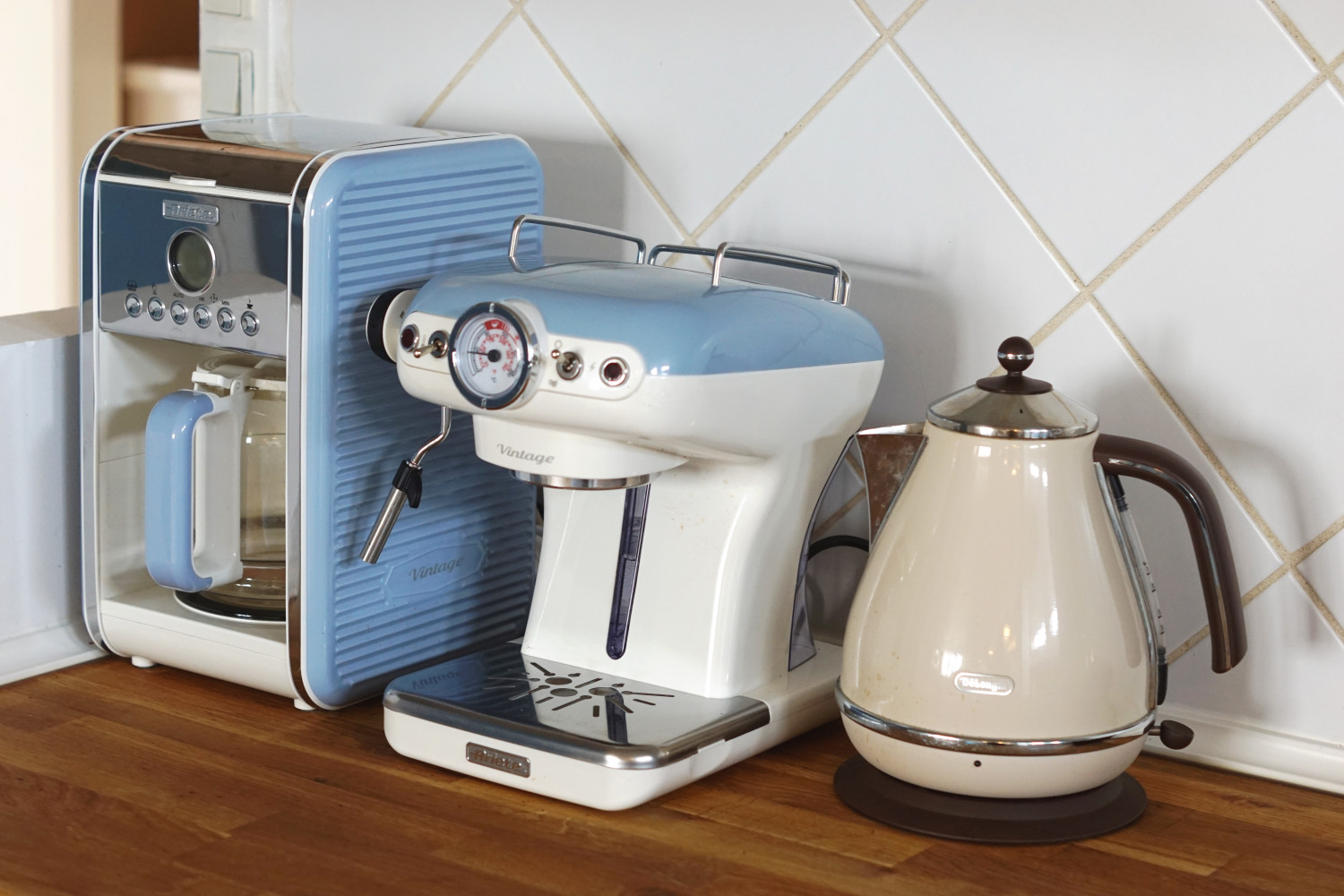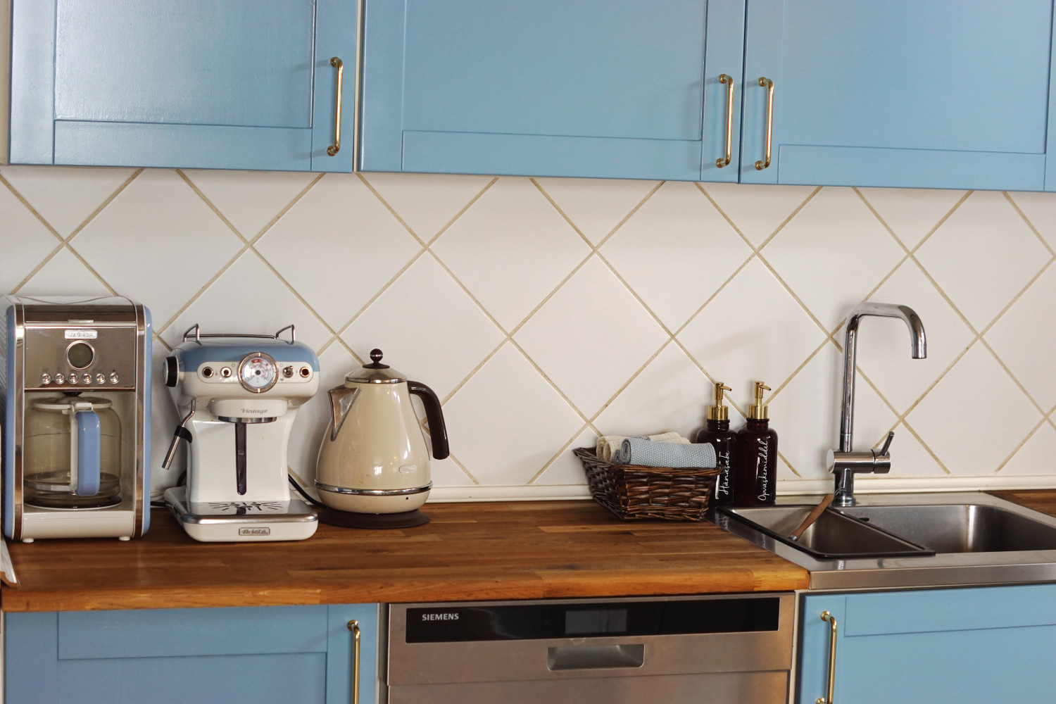 Derudover har vi fortsat retrostilen på vores kaffemaskiner/elkedel, som matcher det blå køkken.