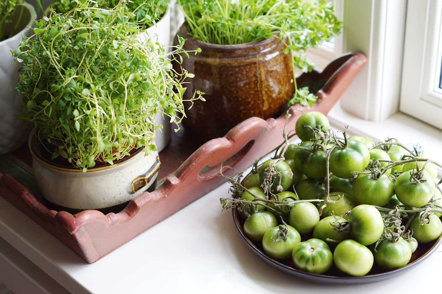 Løsningen blev at tage udgangspunkt i det køkken der var i vores hus og så selv gå i gang med at sætte lister op, skæmme af (hvor der var kig ind bag ved elementerne), slibe hele køkkenet ned og male det i en karakterfuld farve samt slibe og nybehandle bordpladen. Og så indrette med hyggelige detaljer.