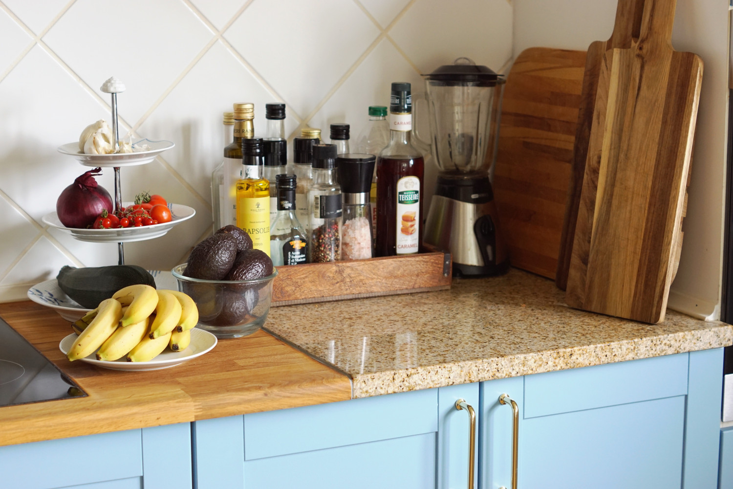 Bordpladestykket i sten er praktisk til afsætning af varme ting. Trækassen til olier og eddike er jeg også utroligt glad for. Så undgår jeg ringe af olie på bordet og det hele ser knap så rodet ud.