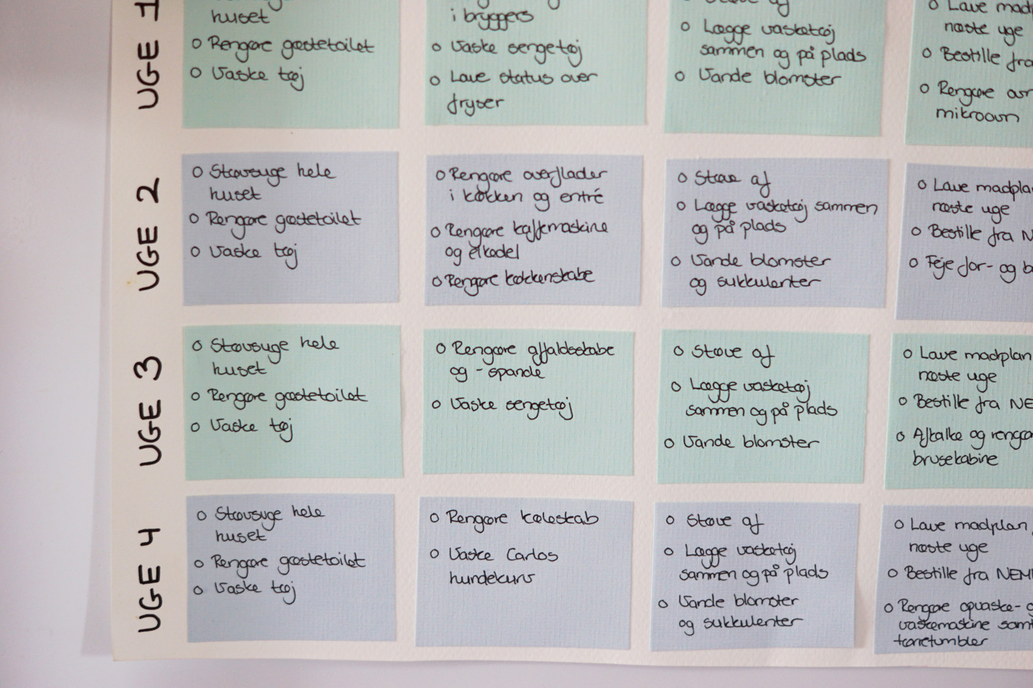 Madplan på ugebasis og en fast rengøringsplan for 4 uger ad gangen hjælper mig med at holde styr på aftensmaden og at rengøring af huset aldrig bliver for uoverskuelig.