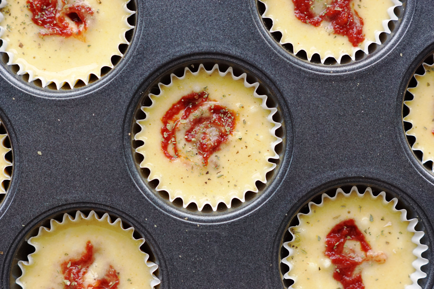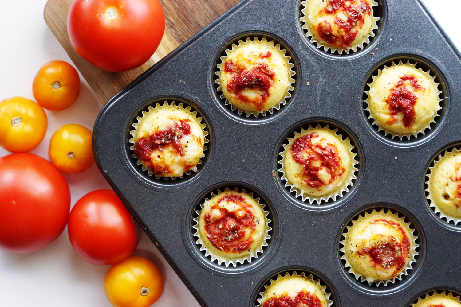 Fordel dejen i små muffinsforme og top med et lille nip tomatpasta (svarende til spidsen af en tsk) i hver muffin. Drys med helt fint tørret oregano.