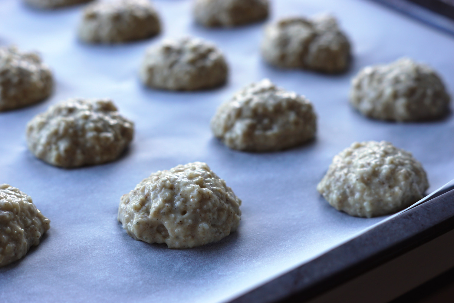 Form små boller med en teske og placer dem på en bageplade beklædt med bagepapir.