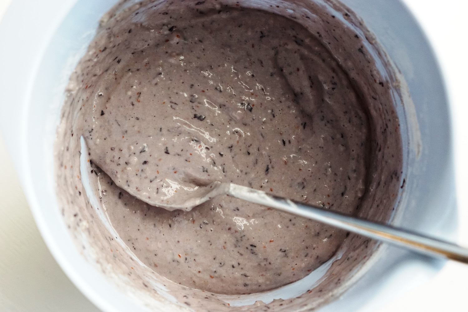 Bland de tørre ingredienser sammen (hvedemel, quinoamel og bagepulver) og rør det sammen med blåbærmassen.