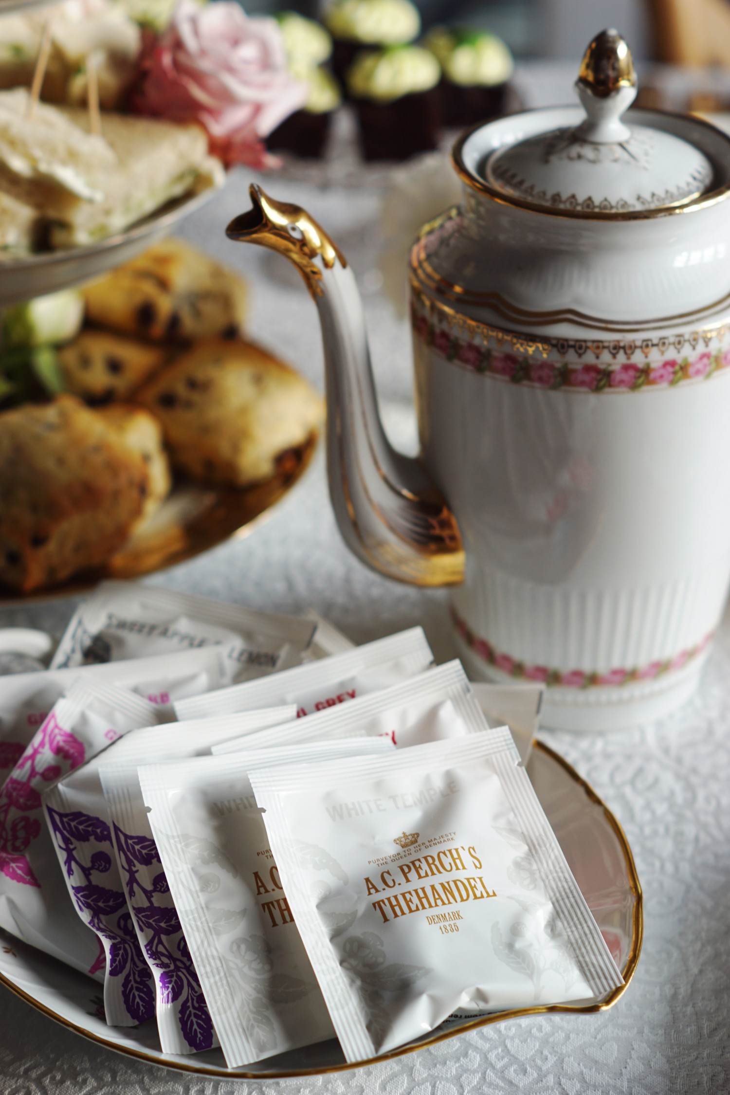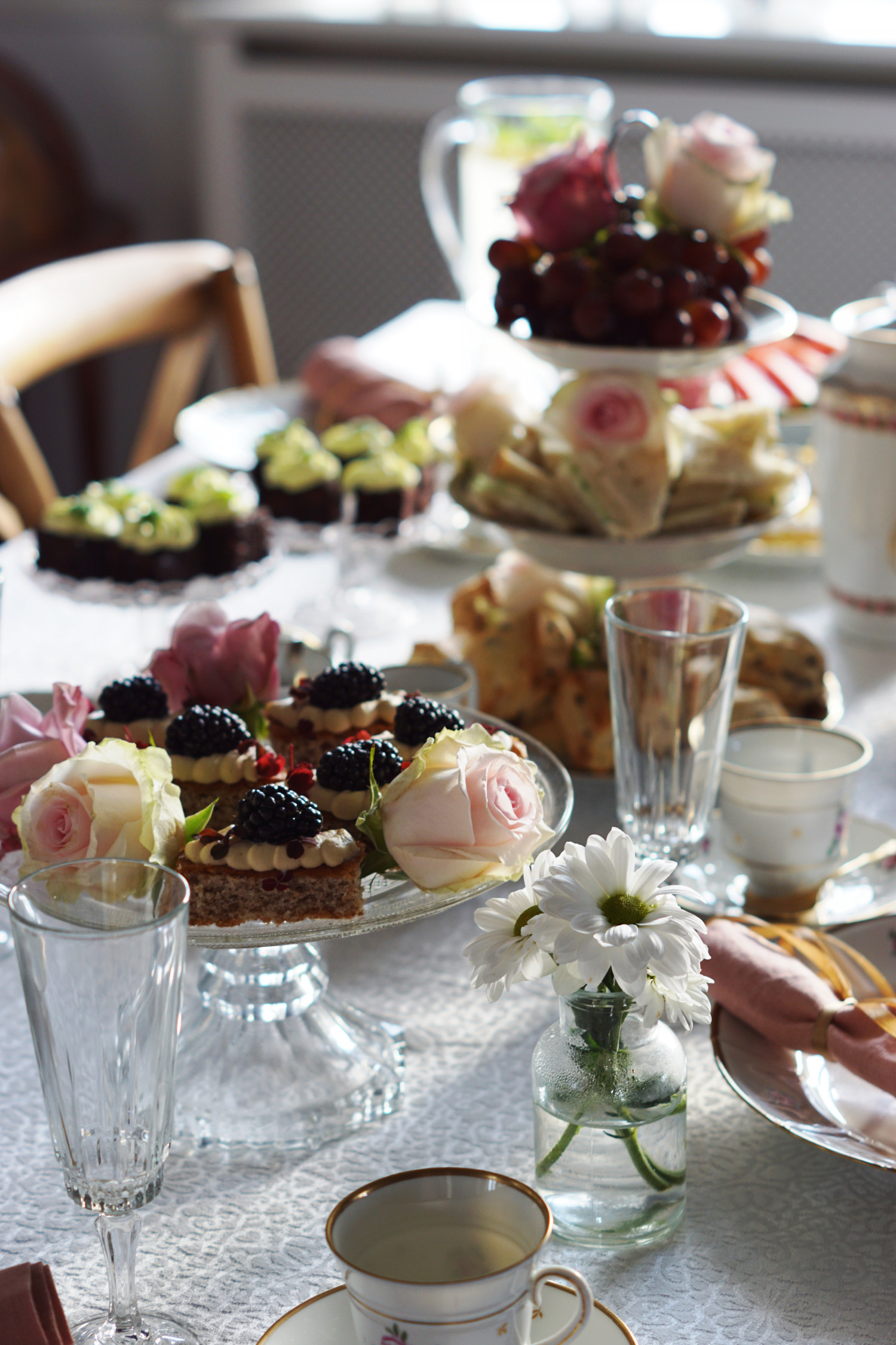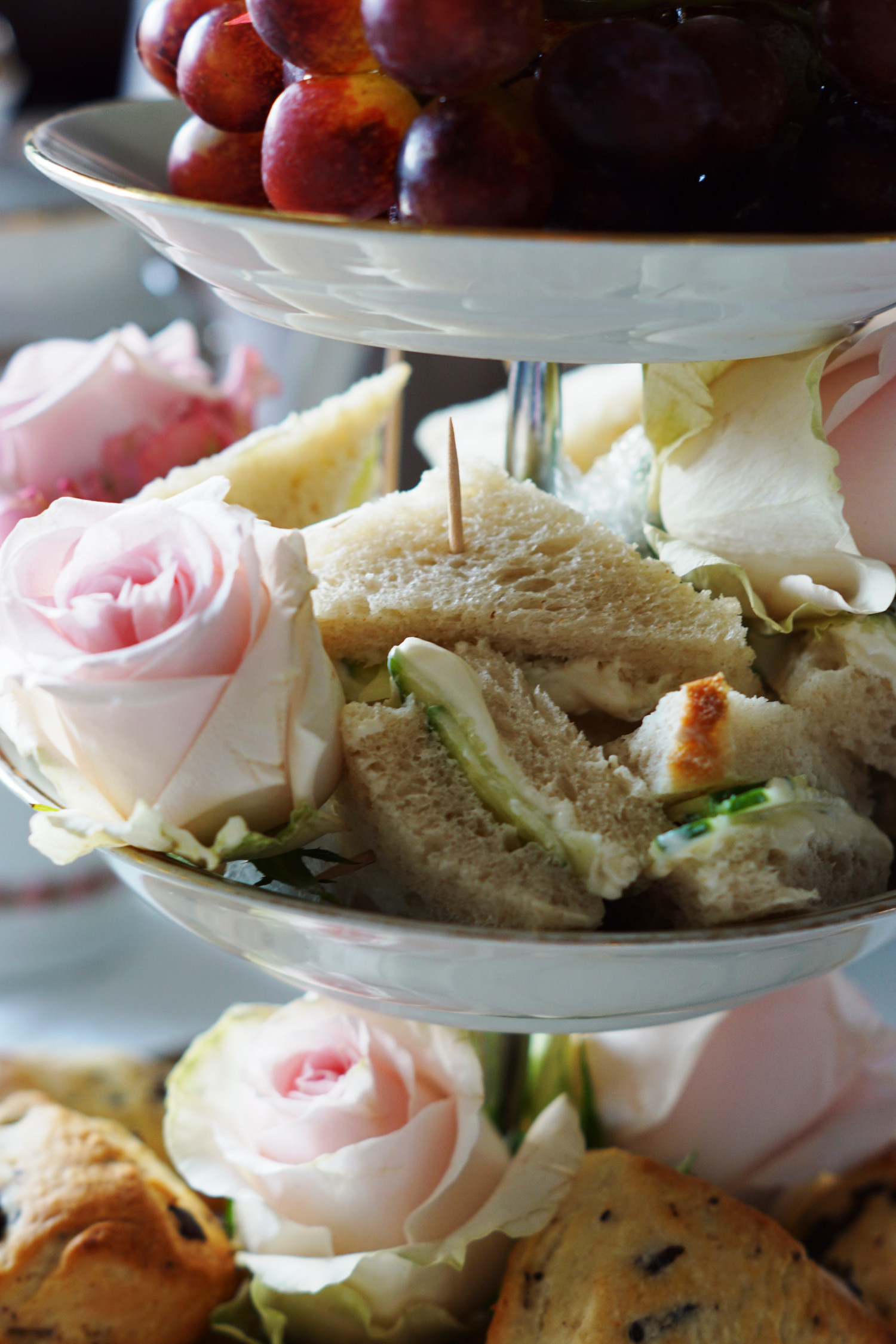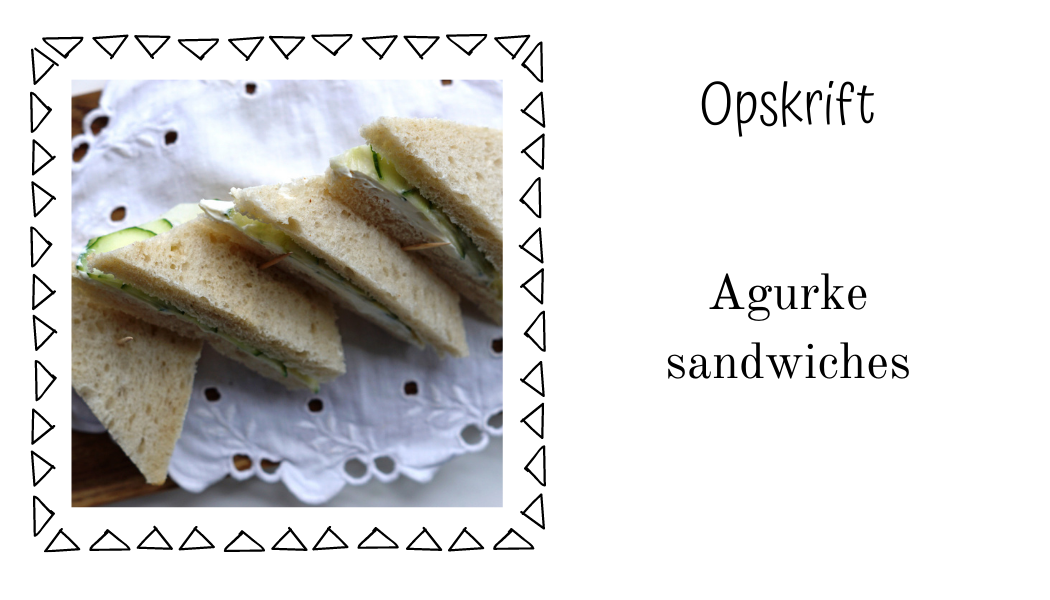 - Agurke sandwiches og scones er selvfølgelig obligatorisk. Derudover skal der være kage og gerne flere slags; gerne både noget med en dyb chokoladesmag, noget friskt og noget syrligt. Vælg kager der er nemme at lave i små tapasstørrelser og pynt dem alt du kan. Jeg linker til mine opskriftsforslag nederst i indlægget her.