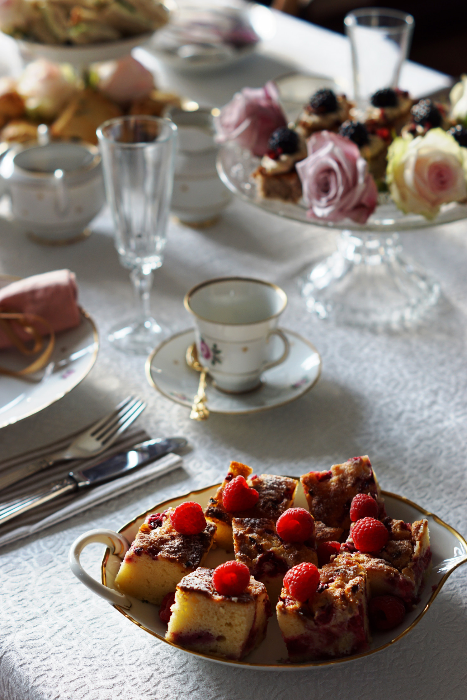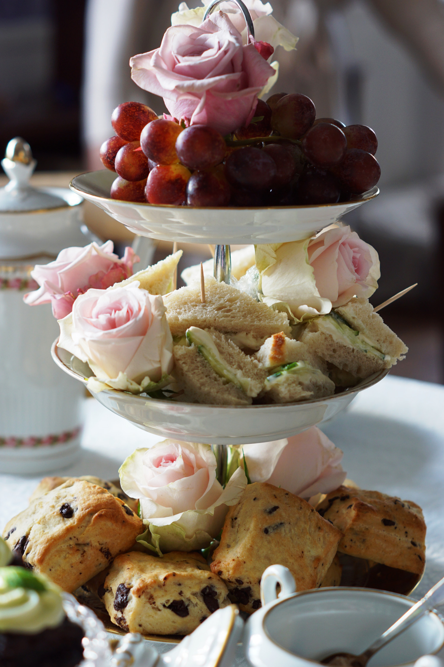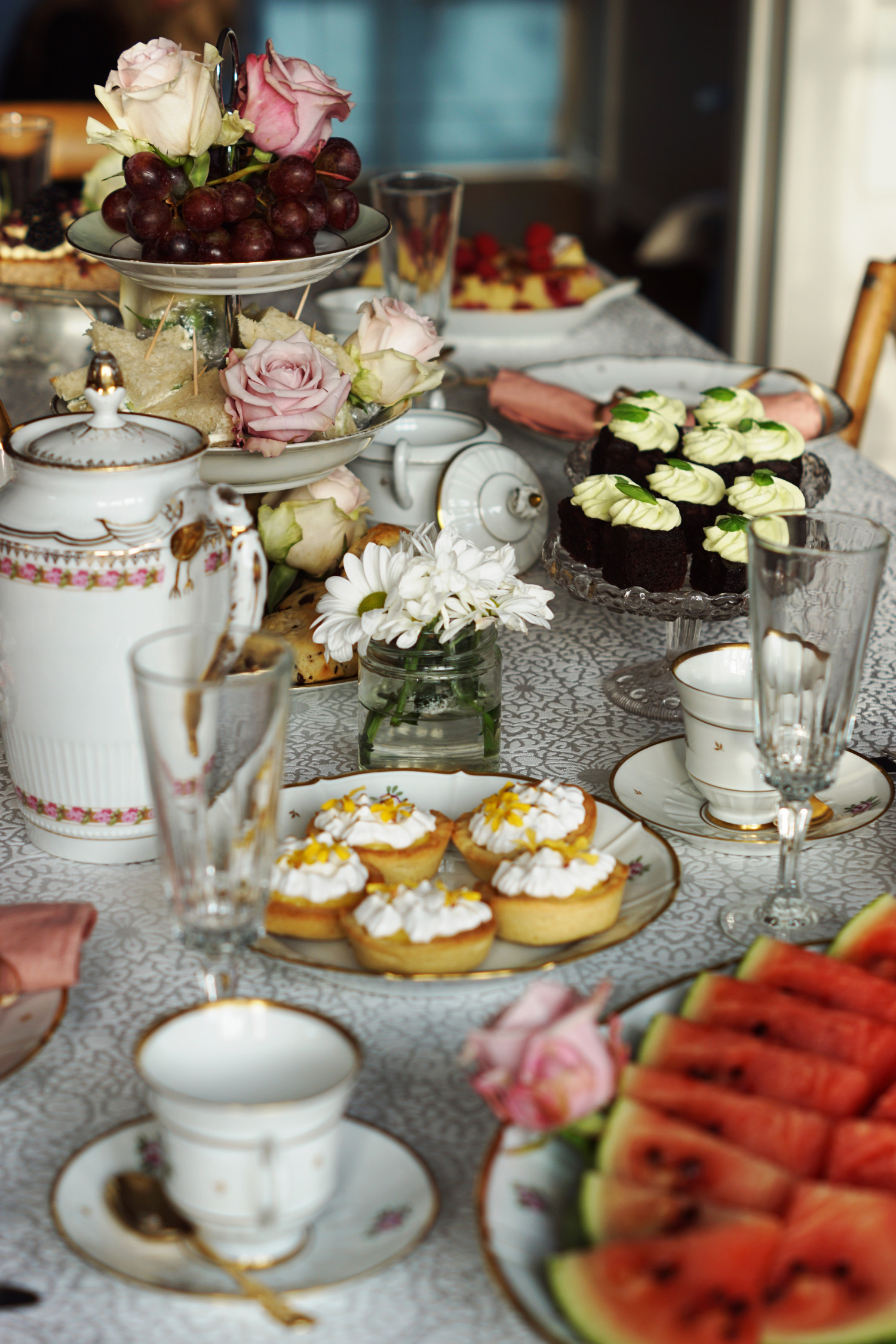 - Agurke sandwiches og scones er selvfølgelig obligatorisk. Derudover skal der være kage og gerne flere slags; gerne både noget med en dyb chokoladesmag, noget friskt og noget syrligt. Vælg kager der er nemme at lave i små tapasstørrelser og pynt dem alt du kan. Jeg linker til mine opskriftsforslag nederst i indlægget her.