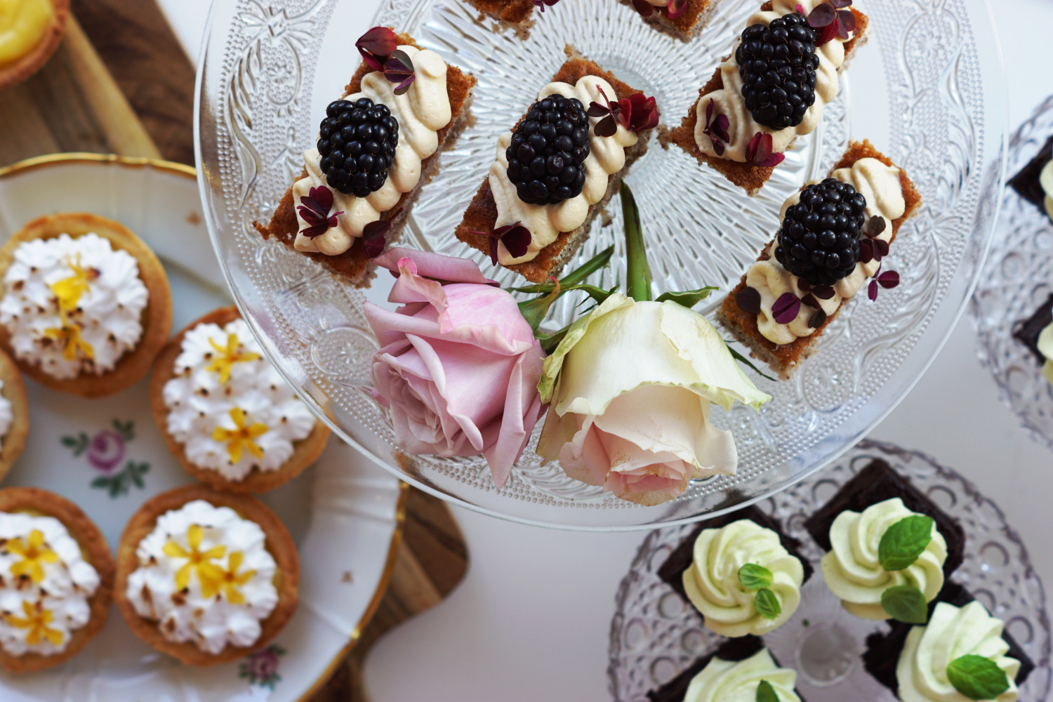 - Tilfør ekstra elegance til bordet ved at stikke roser ind mellem de forskellige kager. Forsegl evt. stilken med husholdningsfilm, så der ikke kommer saft fra stilken på maden.