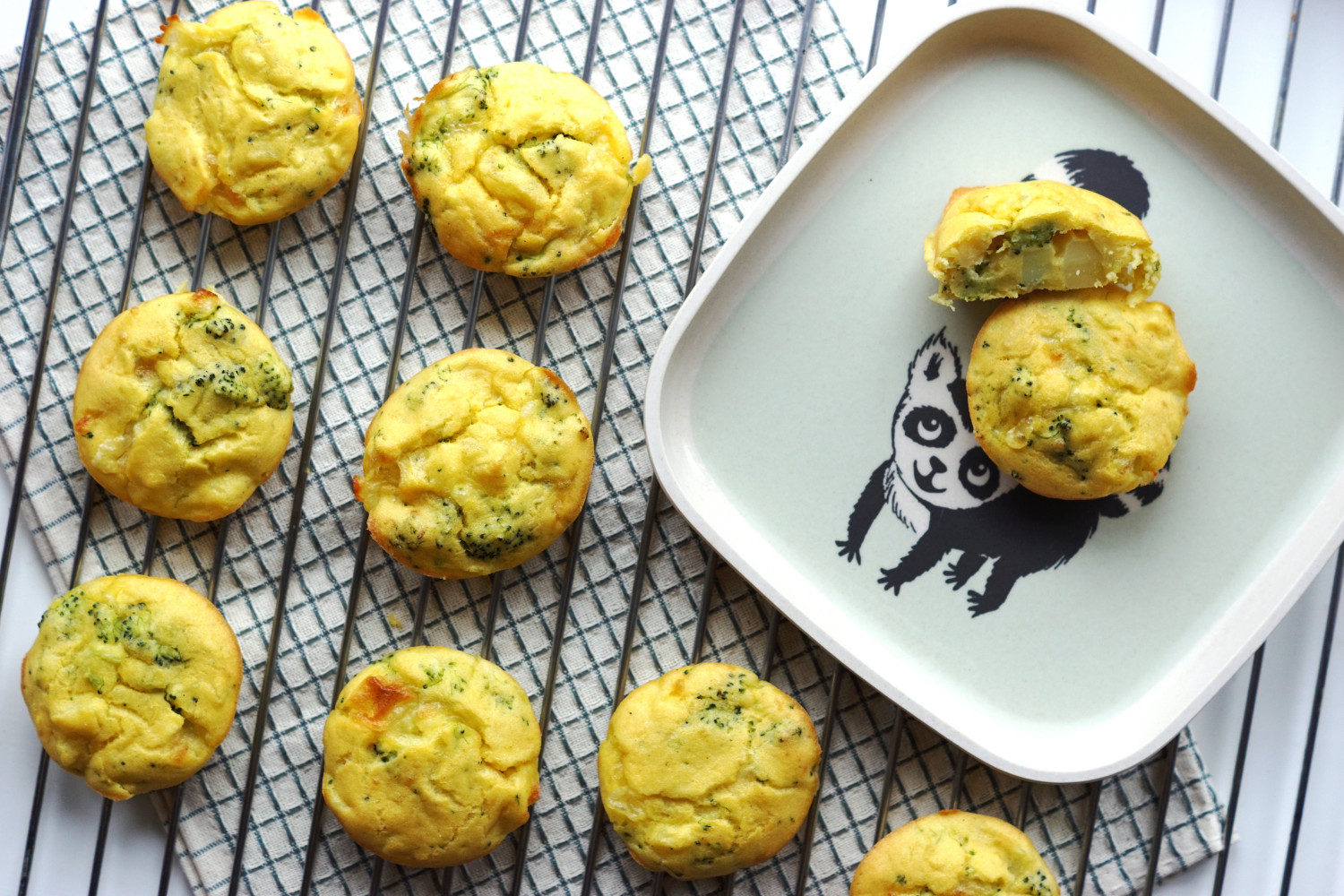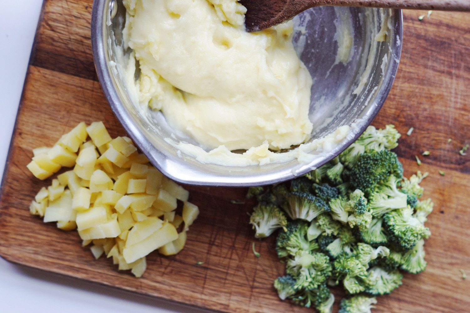 Bland kartoffelmos, bouillionvand, broccoli, kartoffeltern, æg, majsmel og ost sammen. Fordel i muffinsforme (meget gerne en plade af silikone) smurt med solsikke- eller rapsolie.