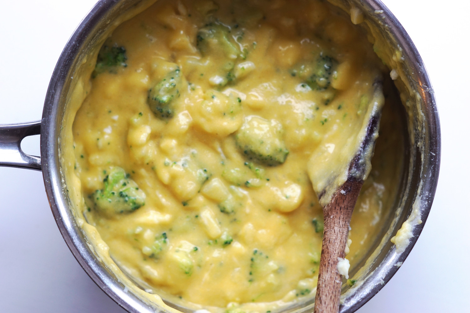 Forbered broccolien og kom det i en gryde med lidt vand. Kog broccolien 2-3 minutter og hæld vandet fra – hold dog en smule vand (1/3 dl) tilbage i en kop. I koppen blander du et lille stykke af en terning grøntsagsbouillion. Brug et stykke på størrelse med en ært, og opløs i det varme vand.