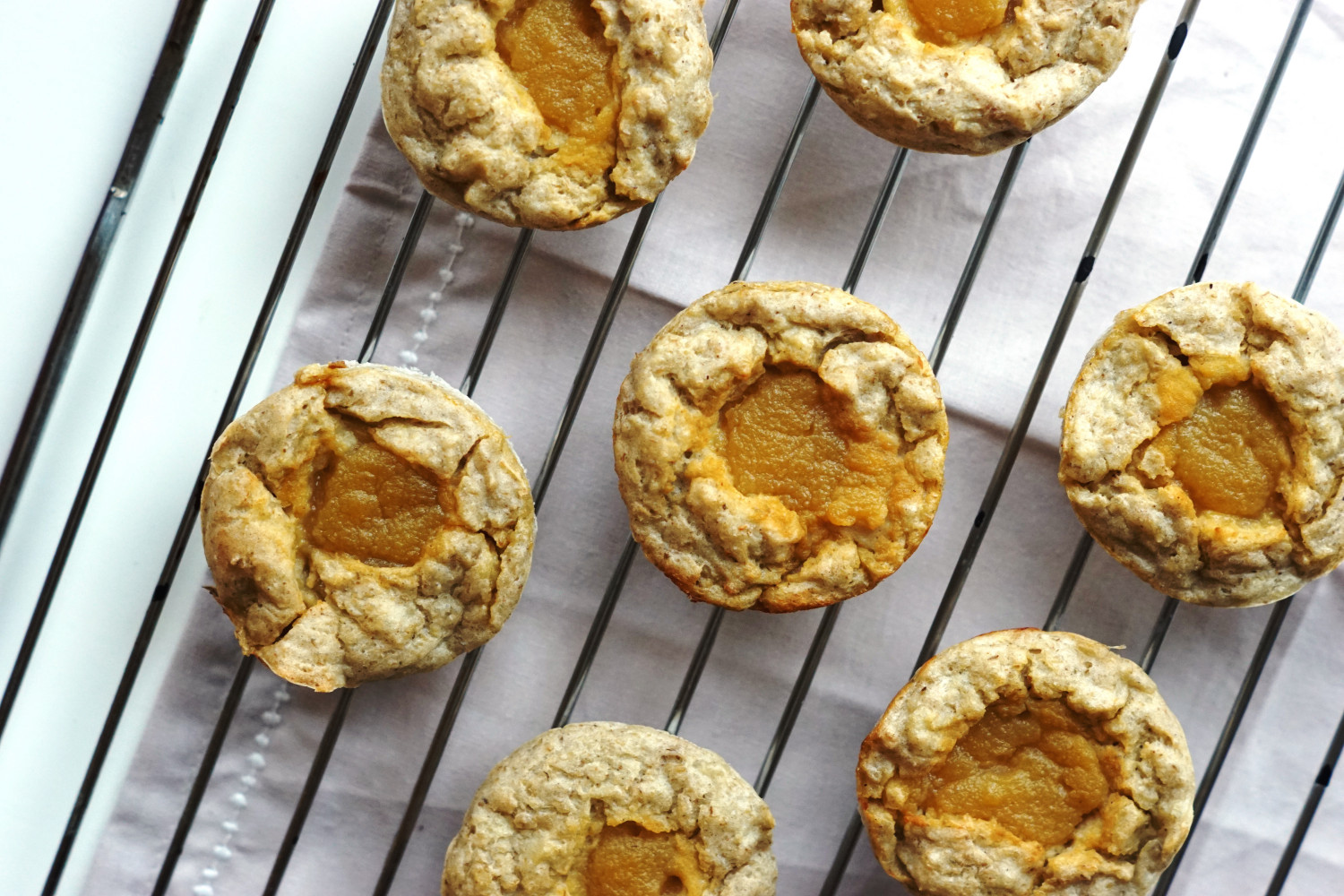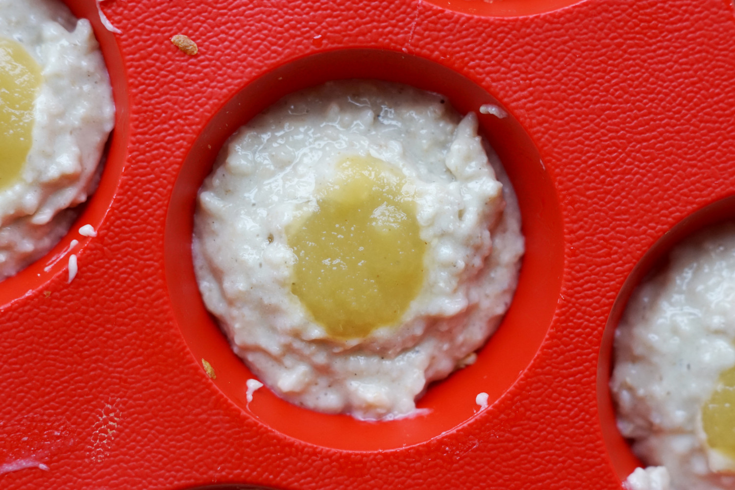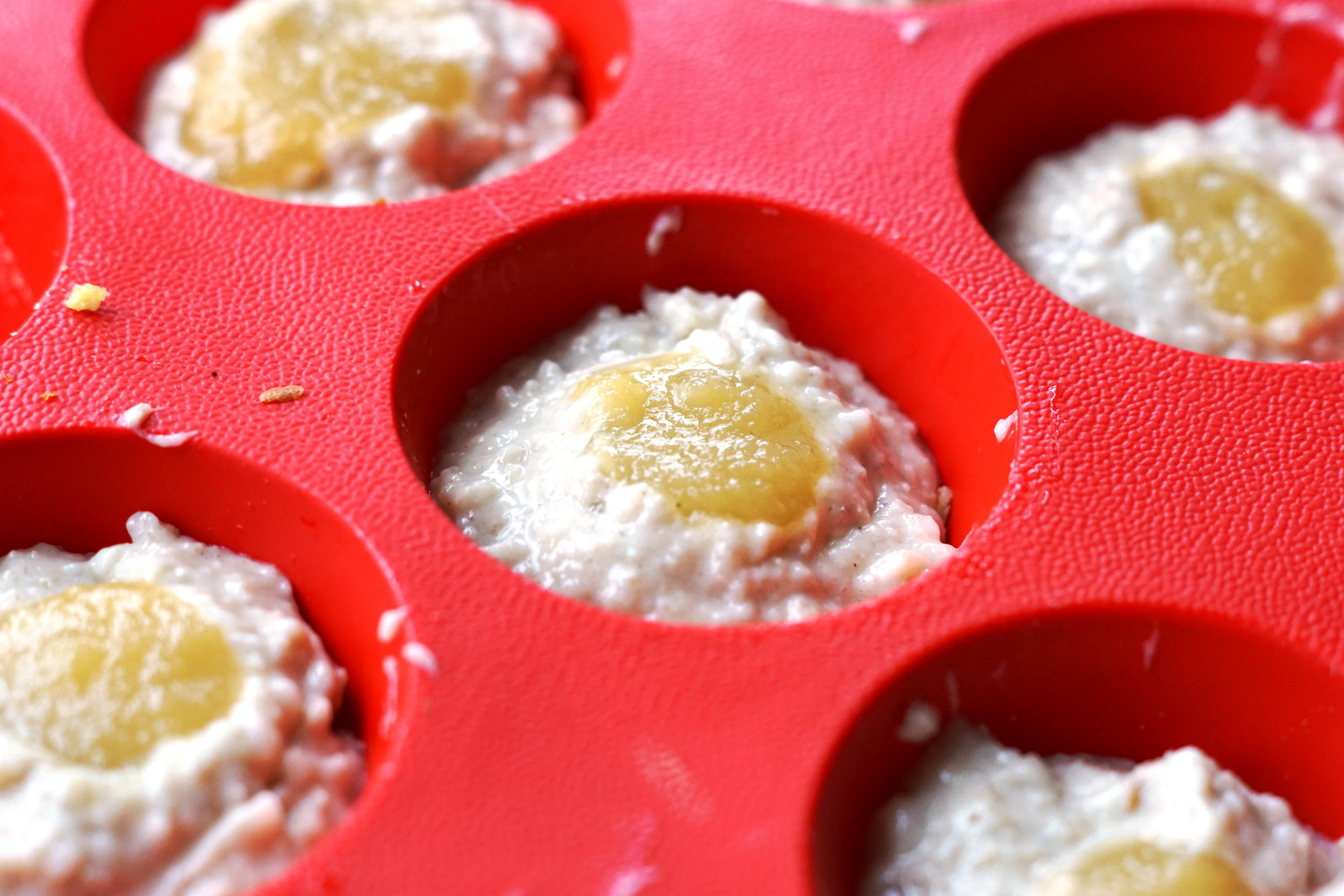 Bland alle ingredienser – undtagen frugtmos – grundigt sammen og fordel i muffinforme smurt med lidt olie.