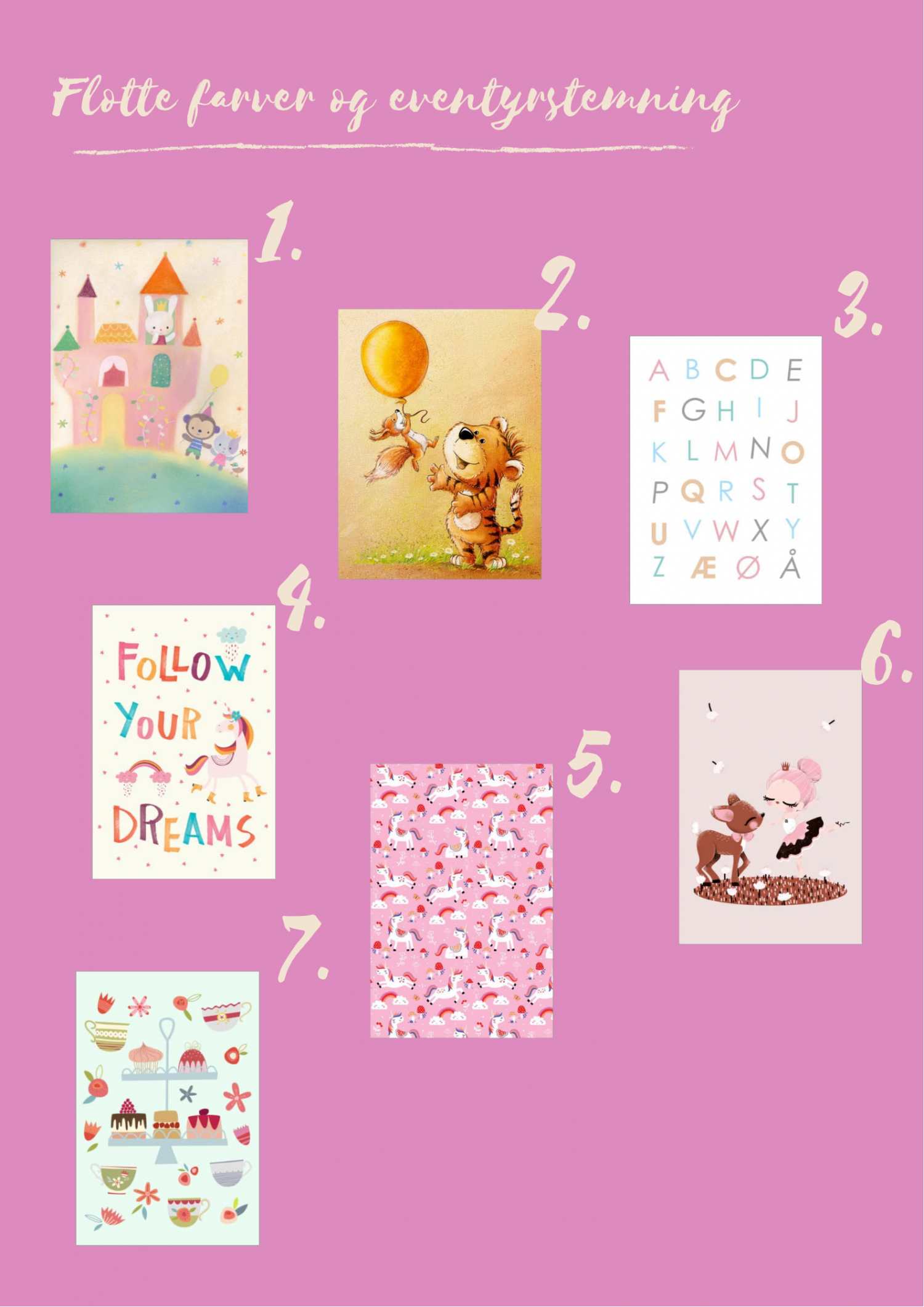 1. Our fairytale castle, Dubravka Kolanovic // 2. Cute tiger with squirrel, Stefan Lohr // 3. Farverigt Alfabet, Typobox // 4. Follow your dream, Marta Munte // 5. Unicorn herd, Louise Anglikas // 6. The dancer and the fawn, Kanzilue // 7. Afternoonn Tea, Nick Squirrell