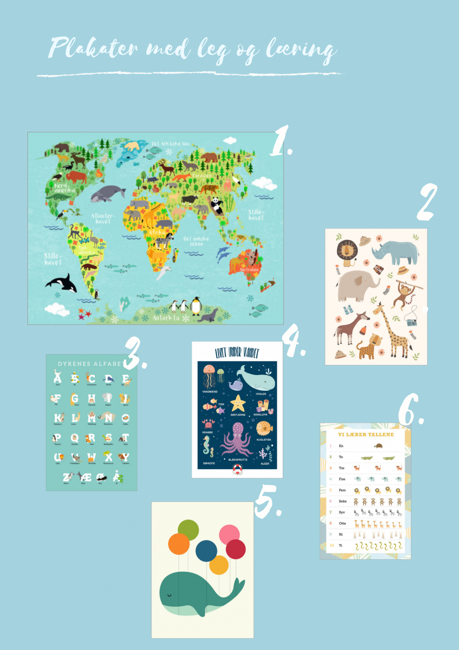 1. Verdenskort med dyr, Kidz Collection // 2. Safari, Marta Munte // 3. Dyrenes alfabet, Kidz Collection // 4. Livet under vandet, Kidz Collection // 5. Dream Walker, Andy Westface // 6. Vi lærer tallene, Kidz Collection