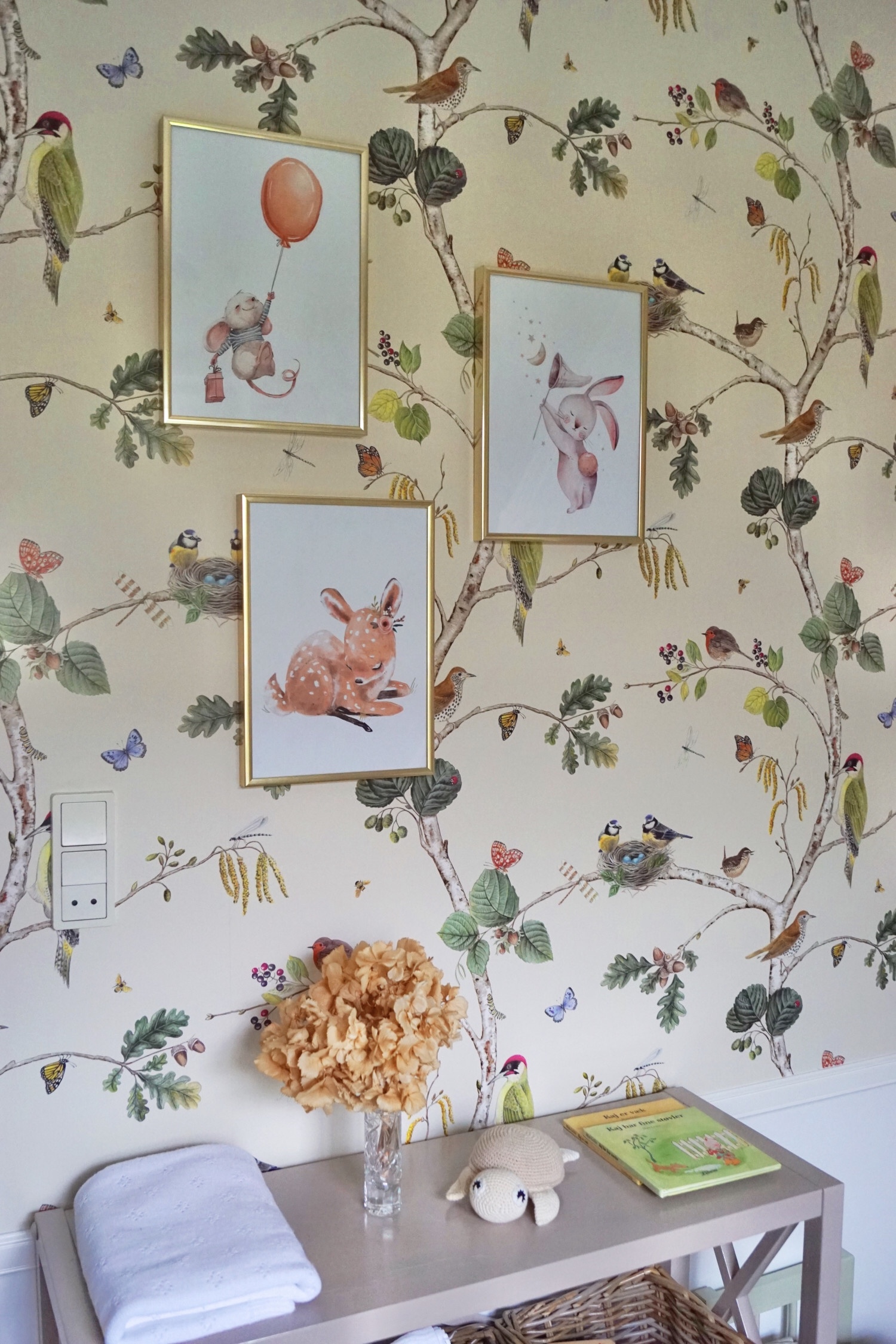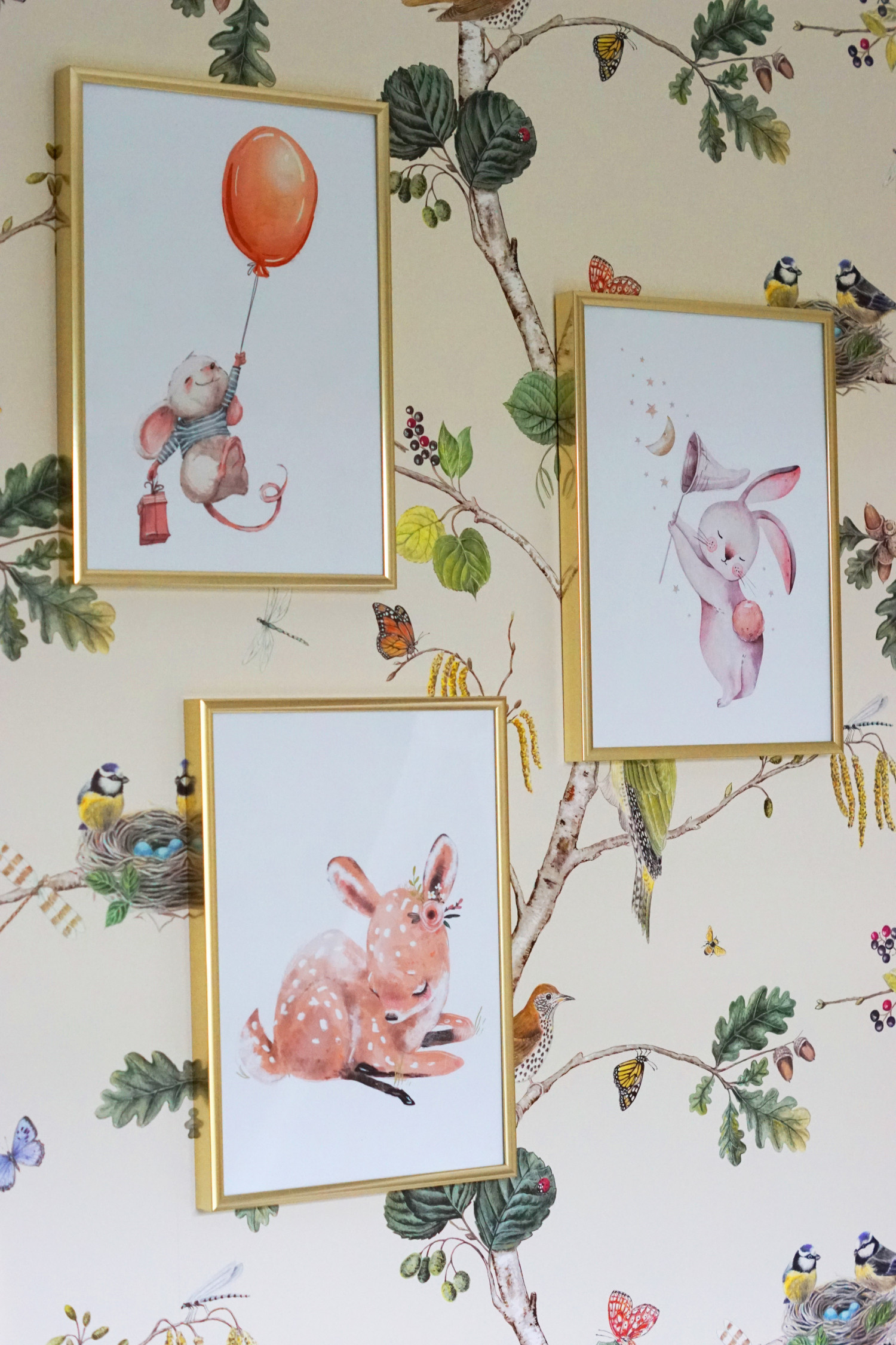 Da der på væggene på Adams værelse sker rigtigt meget pga. tapetet, har jeg valgt at holde mig til få smukke og enkle billeder, som jeg har placeret forskudt af hinanden. Jeg synes disse billeder har yndige motiver, der passer til det “Skovens dyr”-tema, jeg har for hans værelse – og der er massevis af flere billeder i samme stilart og med søde dyr fra skoven at finde på Posterlounges hjemmeside.