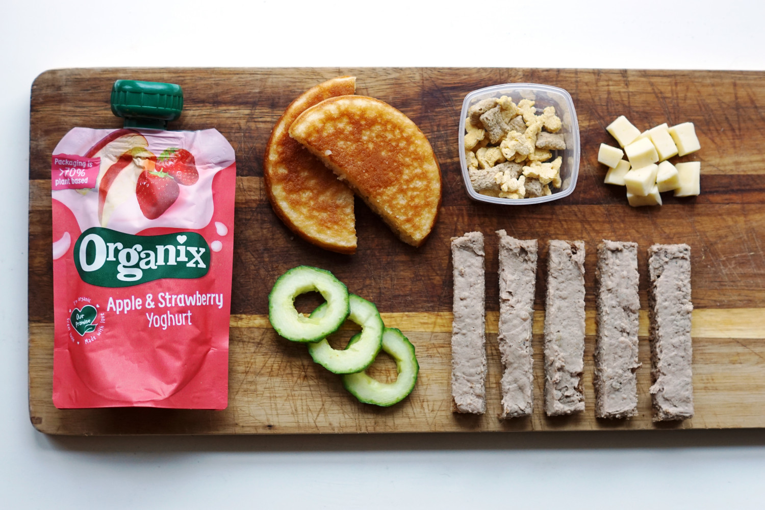 Jeg har givet mine forslag til hvordan tingene skæres (maden er forberedt til Adam på 11 mdr.), men alle børn er forskellige og kan have individuelle udfordringer ift. tygge/synketeknik og hvordan de bedst og nemmest håndterer maden. Du kan derfor naturligvis selv tilpasse hvordan tingene udskæres til netop dit barn; om det skal være helt små stykker, om det skal være stave eller lidt større stykker der kan bides og gumles af. Dette vil naturligvis også være forskelligt alt efter barnets alder; om det er 10 mdr. eller knap 2 år. Mængden af indholdet i madpakken kan også tilpasses det enkelte barns appetit og alder.