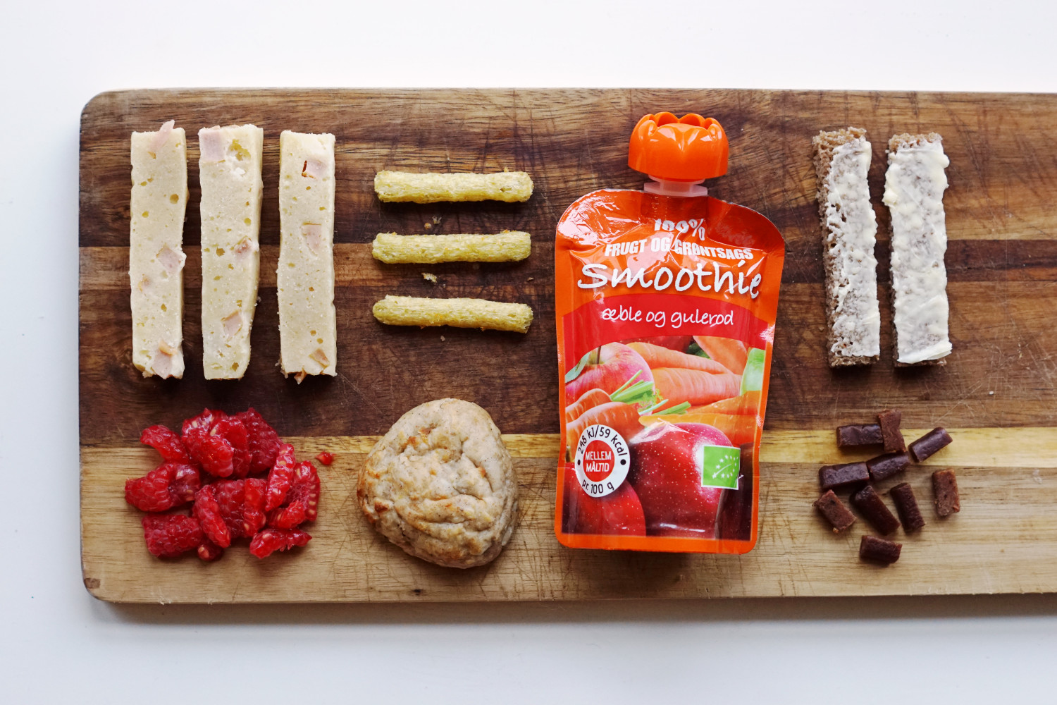 Pølsehornsstave (opskrift nederst i indlægget), hindbær i kvarte, majspuffs, grødbolle (opskrift nederst i indlægget), smoothie m. gulerod og æble, rugbrødsstave m. smør og stykker af figensnack.