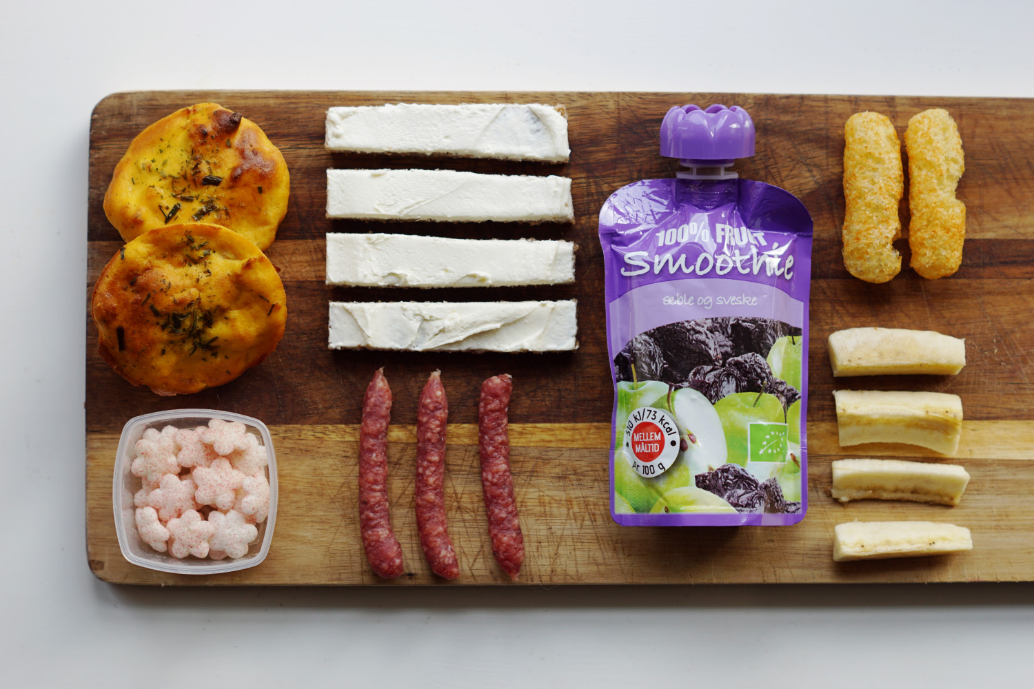 Sødkartoffel og kylling hapsere, hindbærpuffs, kernefritrugbrød m. mascarpone, salamisnacks, smoothie m. æble og sveske, majspuffs og bananstave.
