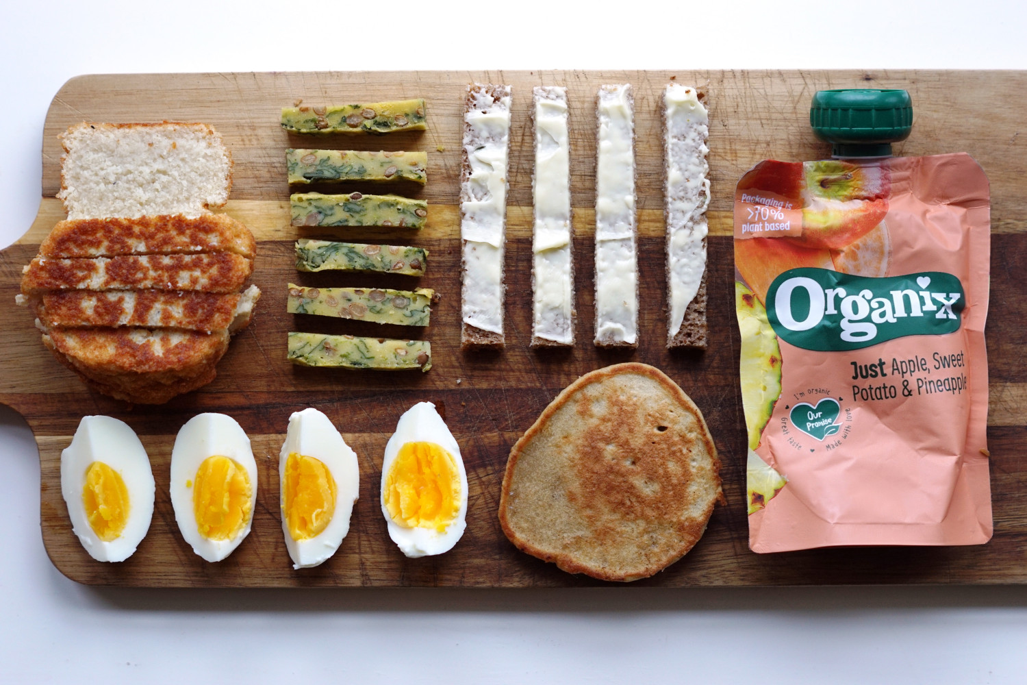 Fiskefrikadelle (torsk), kogt æg, stave af spinat-linsehapser (opskrift nederst i indlægget), rugbrødsstave m. smør, banan-boghvedepandekage (opskrift nederst i indlægget) og smoothie m. æble, sød kartoffel og ananas.
