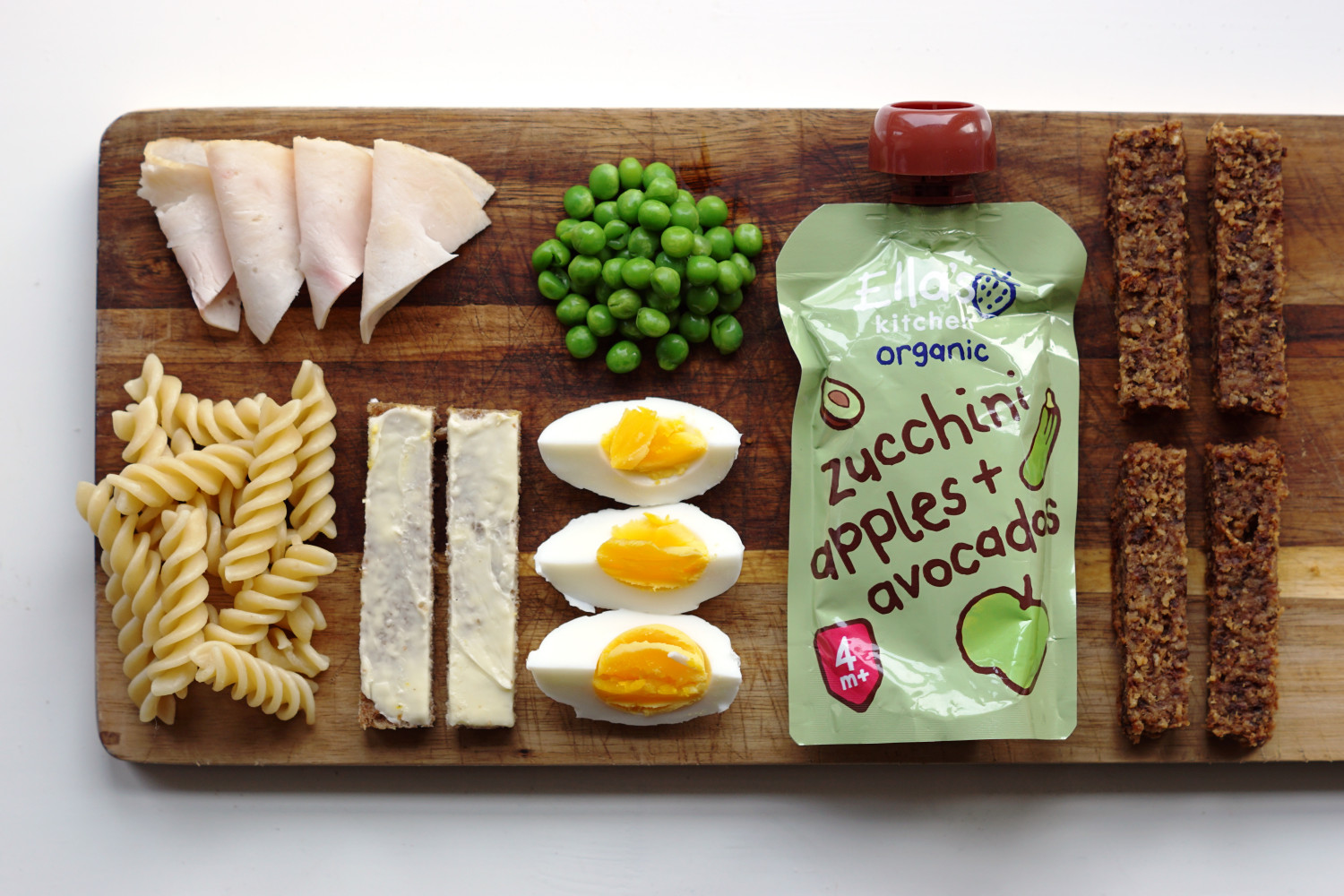 Kyllingepålæg, pastaskruer, rugbrødsstave m. smør, kogte ærter, kogt æg, smoothie m. squash, æble og avocado og sveskebarer (opskrift nederst i indlægget).