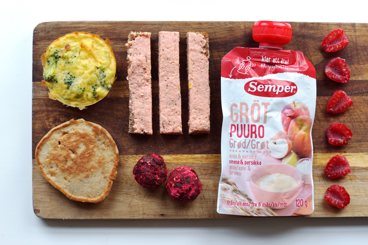 Broccoli-kartoffelhapser, mini banan-boghvedepandekage, kernefrit rugbrød m. laksepaté, trøffelsnack, grødsmoothie og friske hindbær i kvarte.