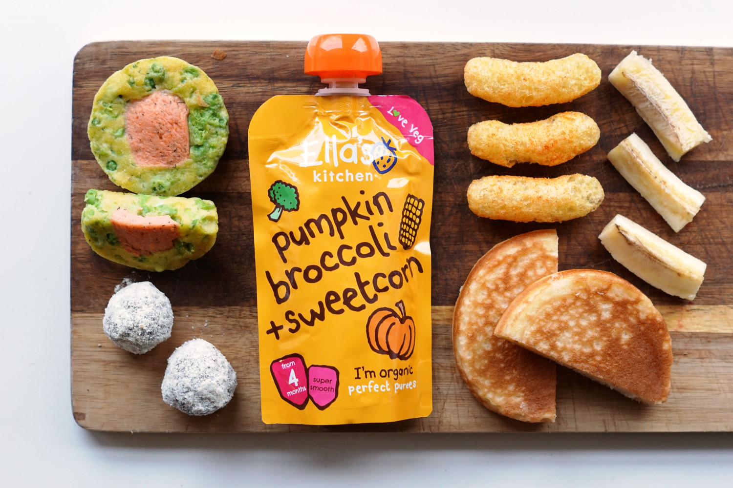 Laks og ærtehapser, trøffelsnack, smoothie m. græskar, broccoli og majs, majssnack, tyk pandekage og bananstave.